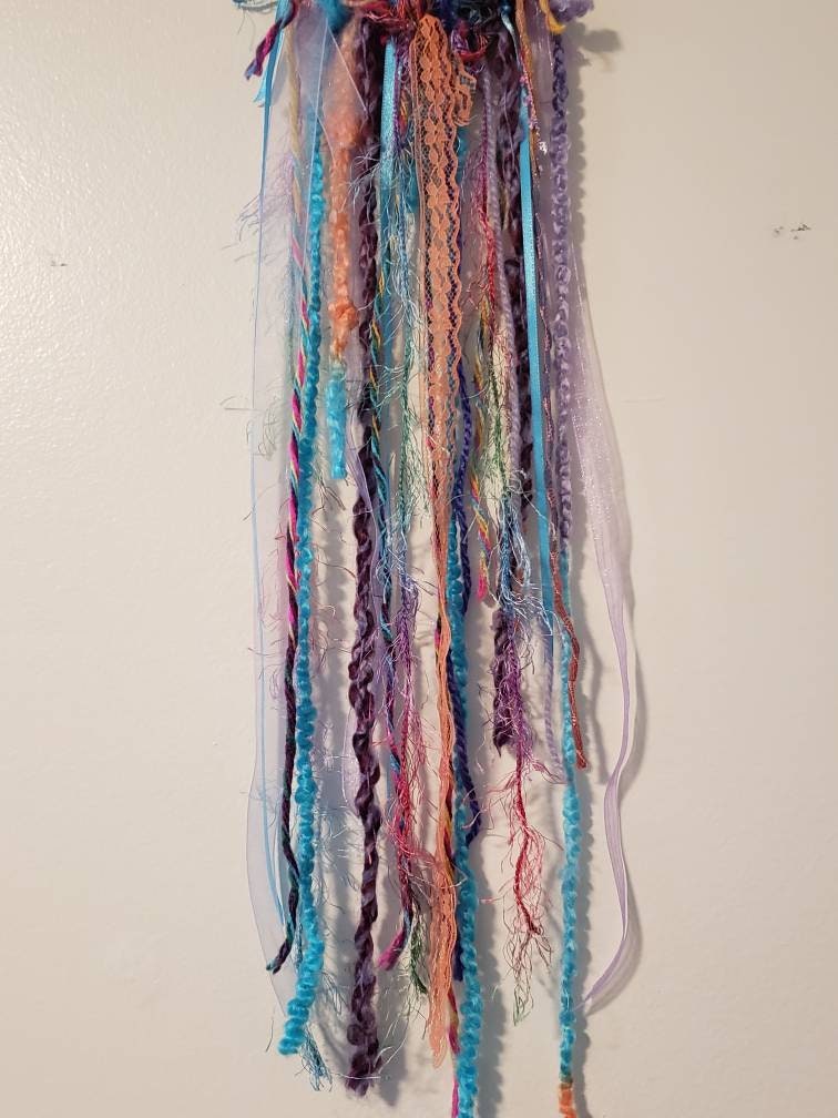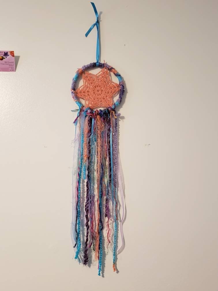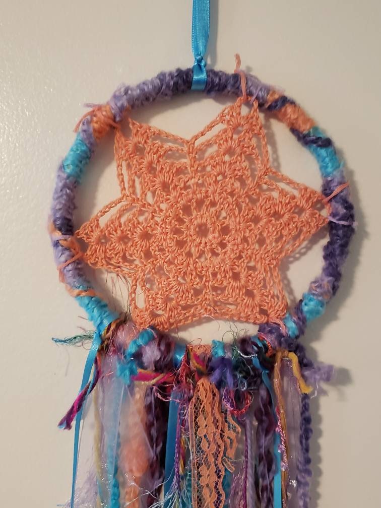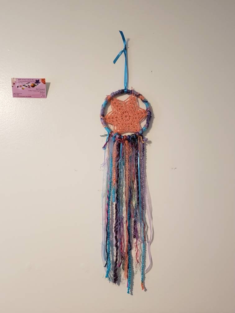 All my crafts are unique. I use any crochet doiley into dream catcher with mixture of different fabric materials.