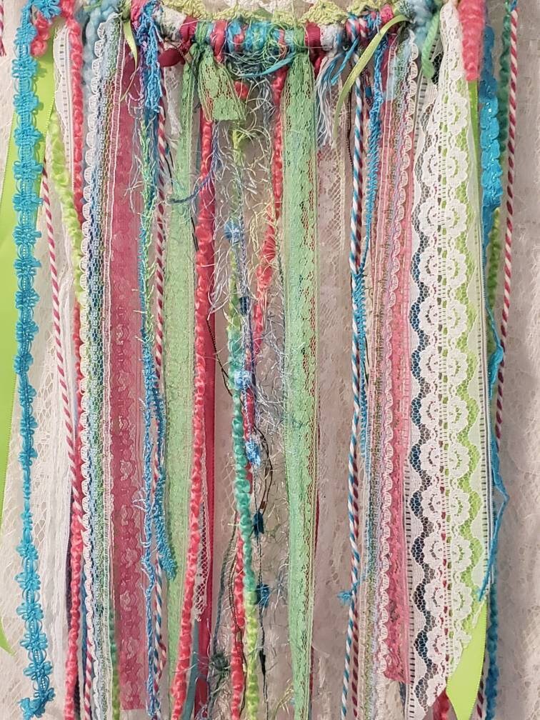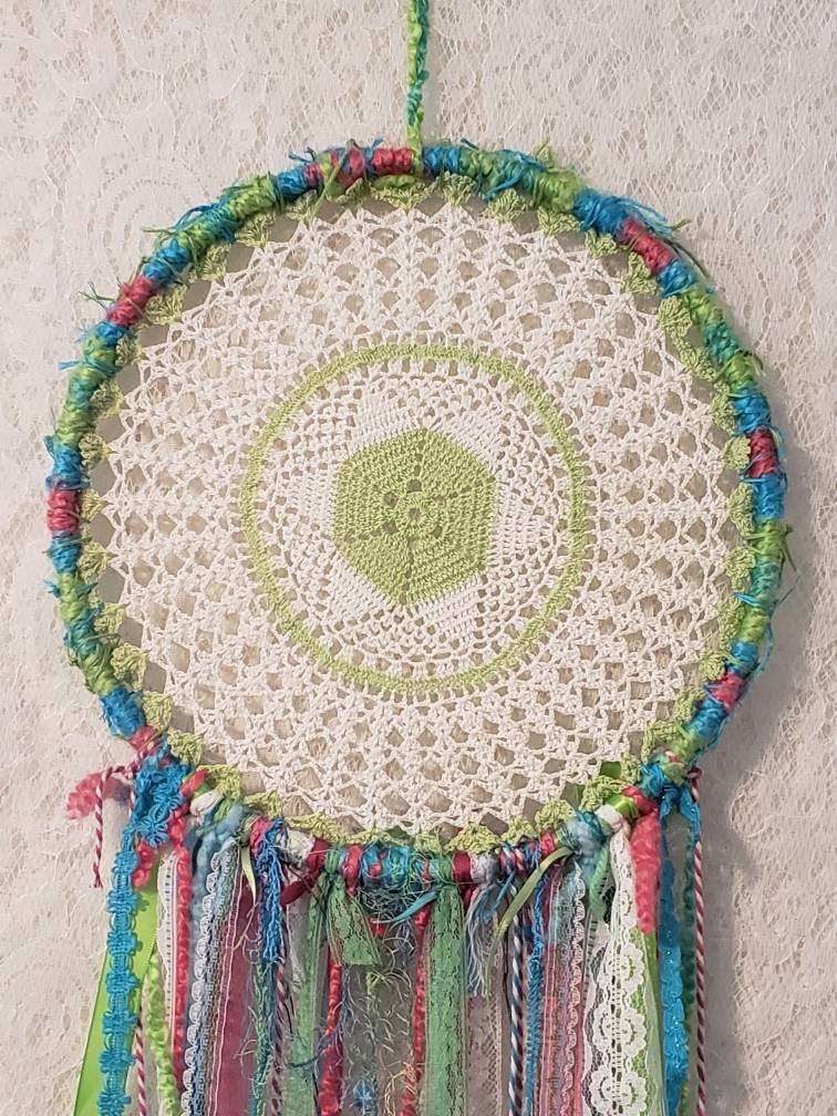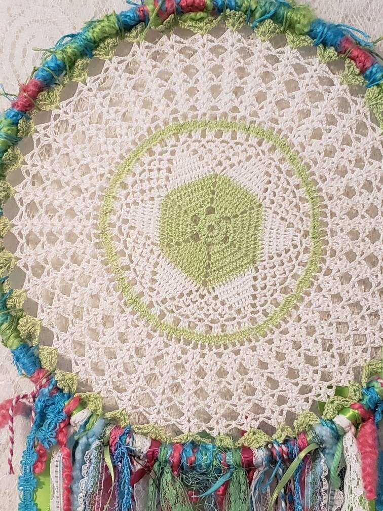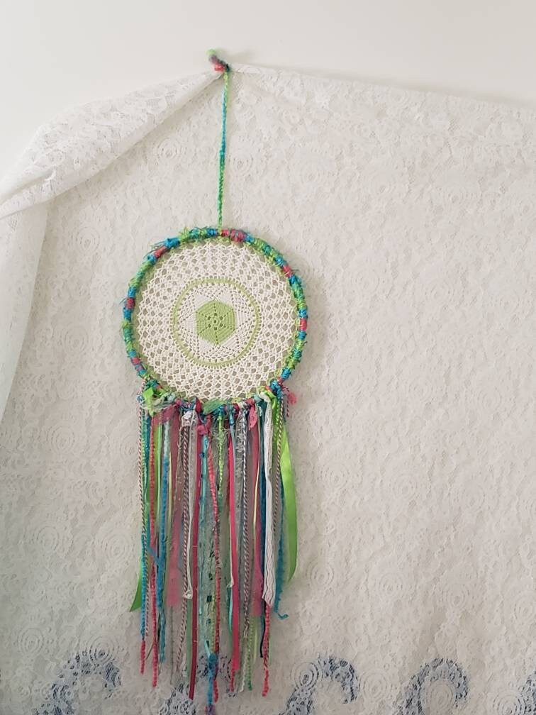 Beautiful colorful medium/large dream catcher. Colors of lime green, hot pink, & aqua. Vintage doiley & ribbons.