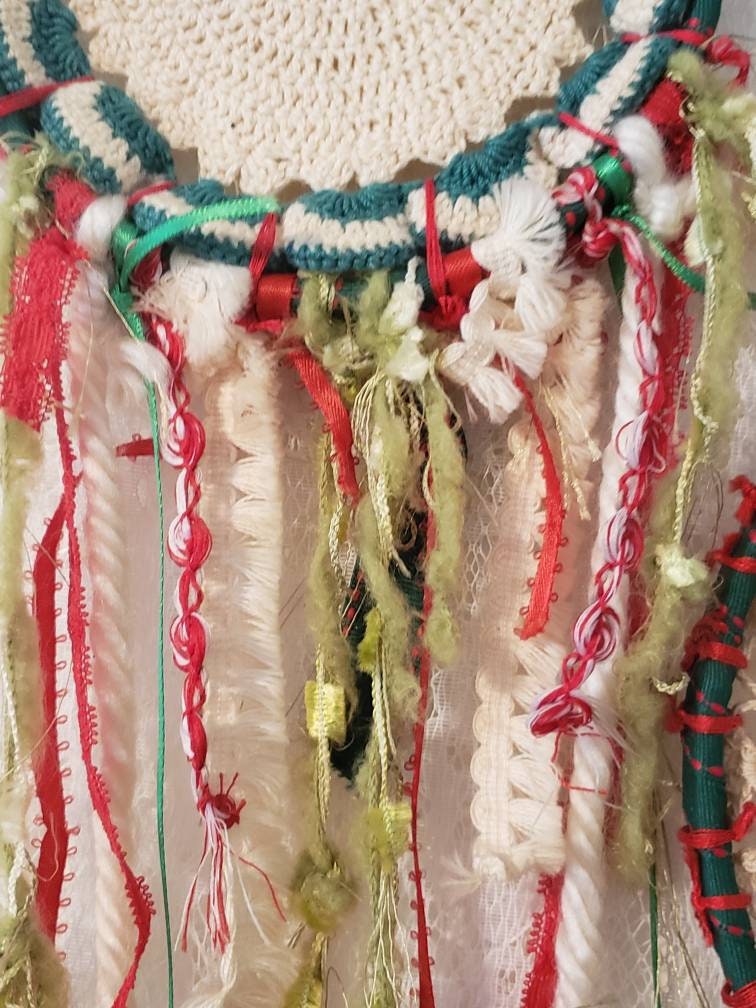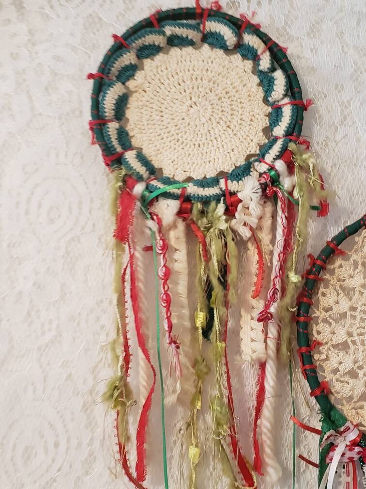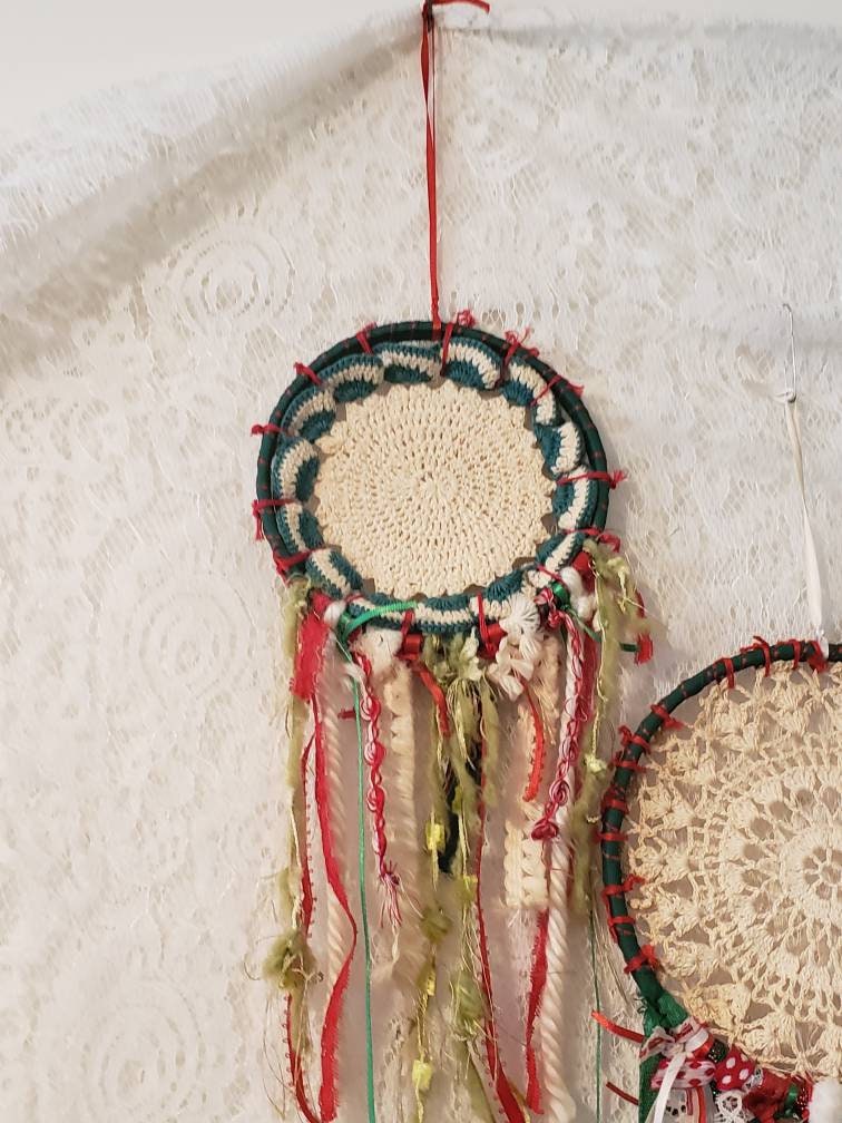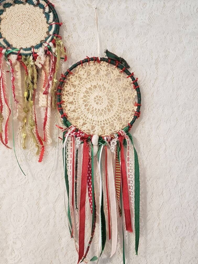 2 unique Christmas colors dream catchers. This is 2 piece set. Small dream catchers, vintage mix of fabric materials, perfect for a country Christmas theme too. Colors of greens, reds, & whites.