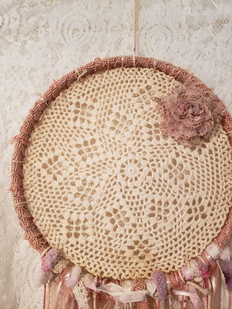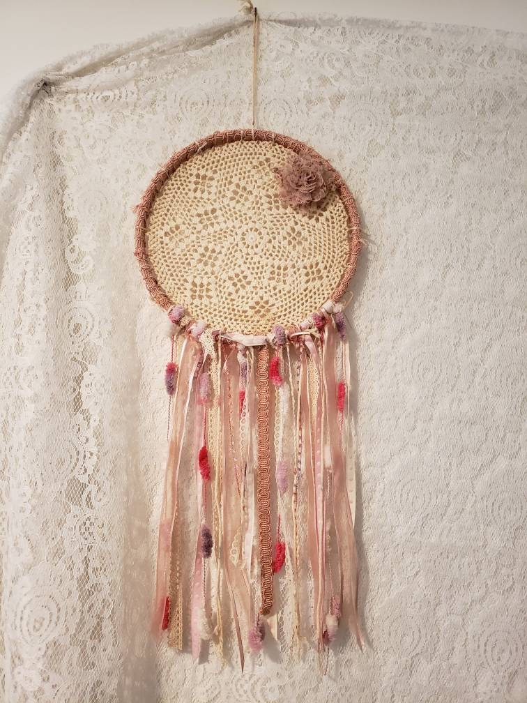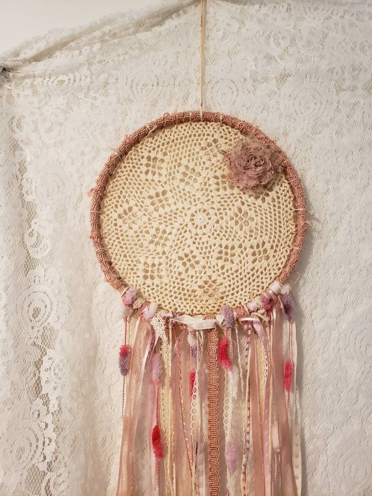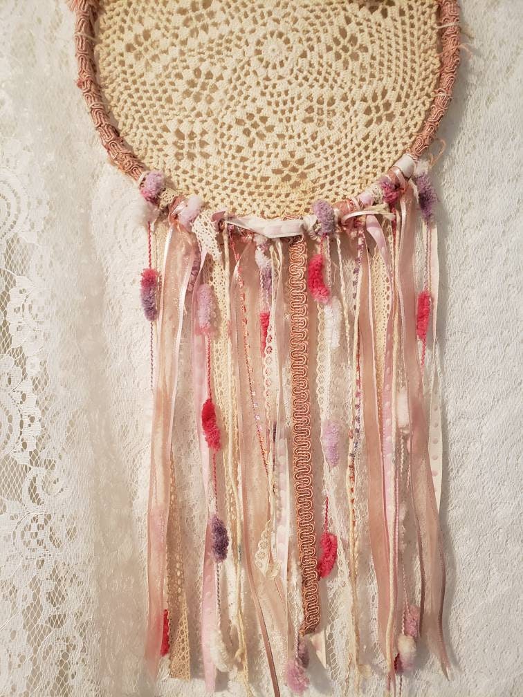 Boho Dream Catcher: Pink Vintage Doily, Aromatherapy Decor