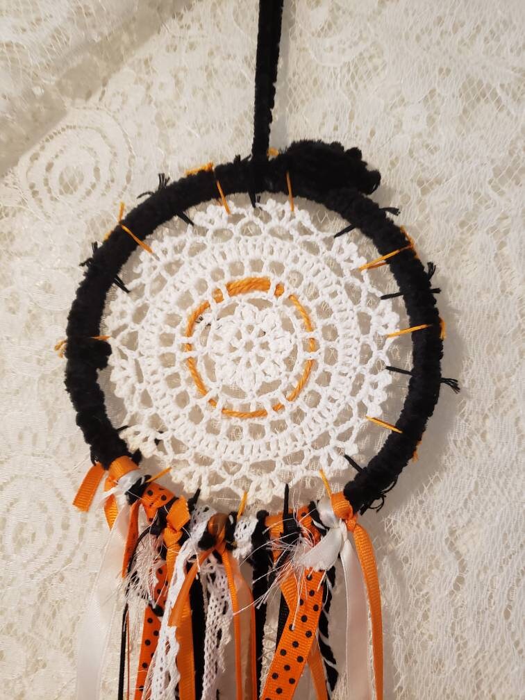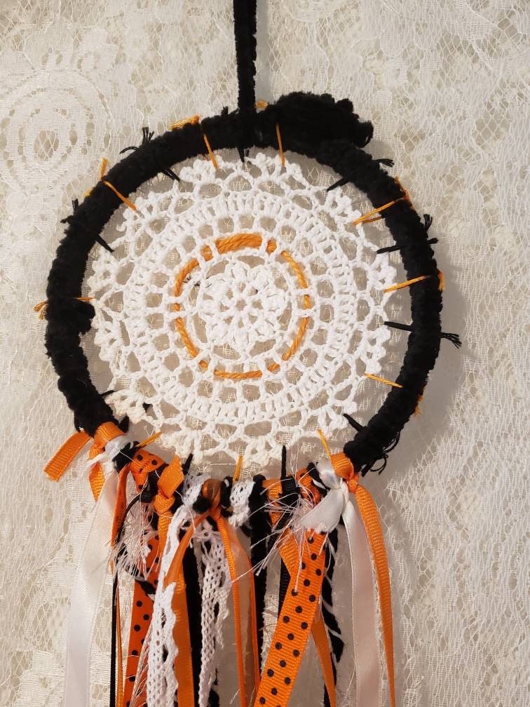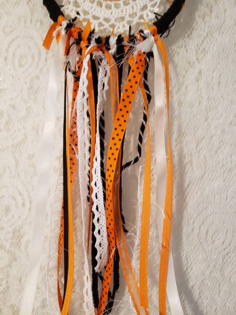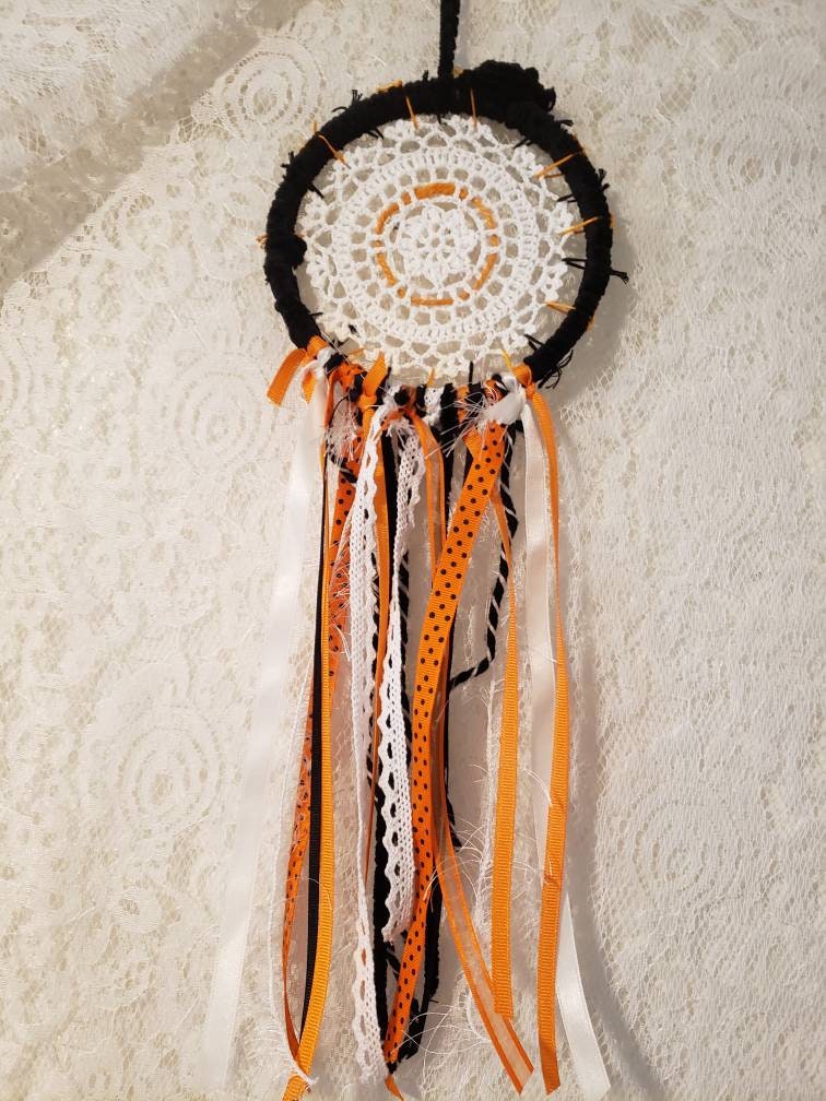 Cute colorful dream catcher with Halloween colors. Handmade with vintage doiley and fabric materials.