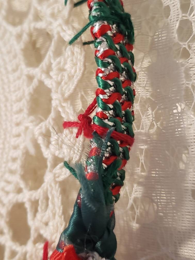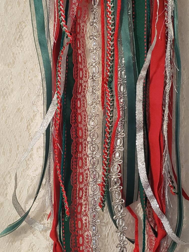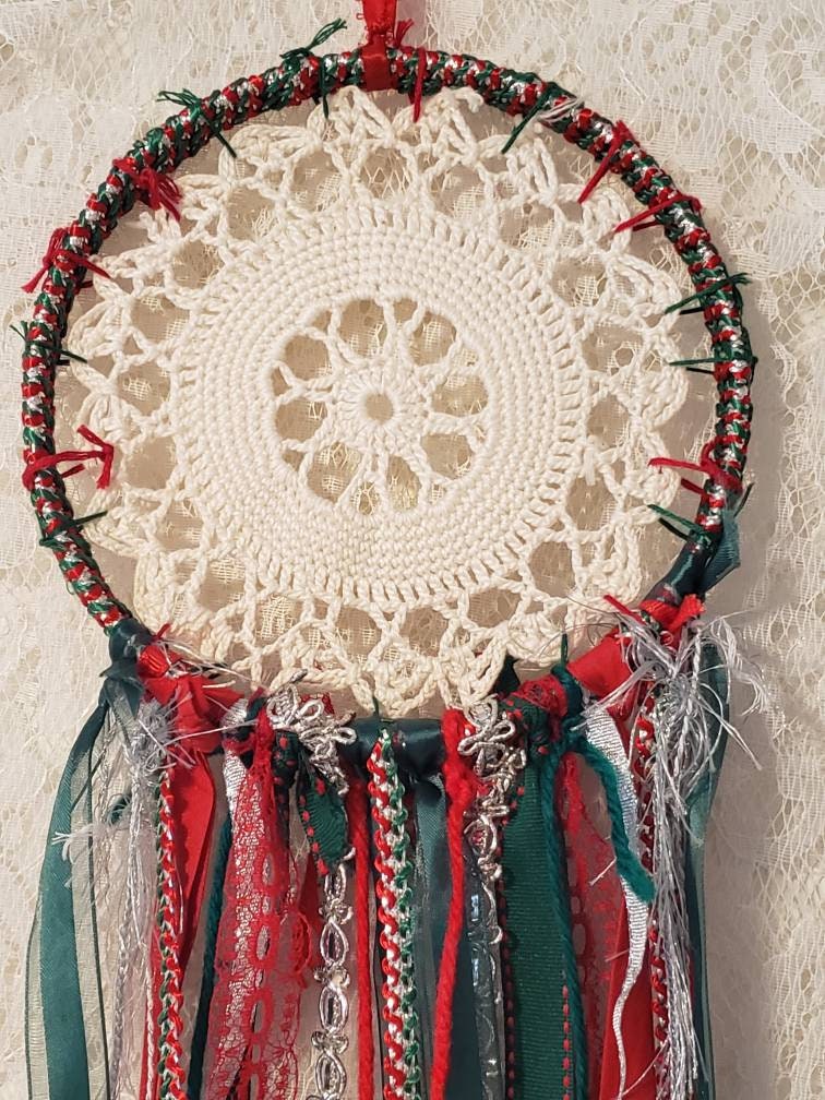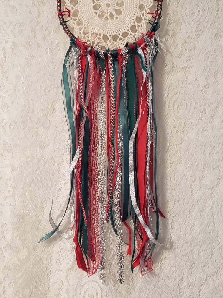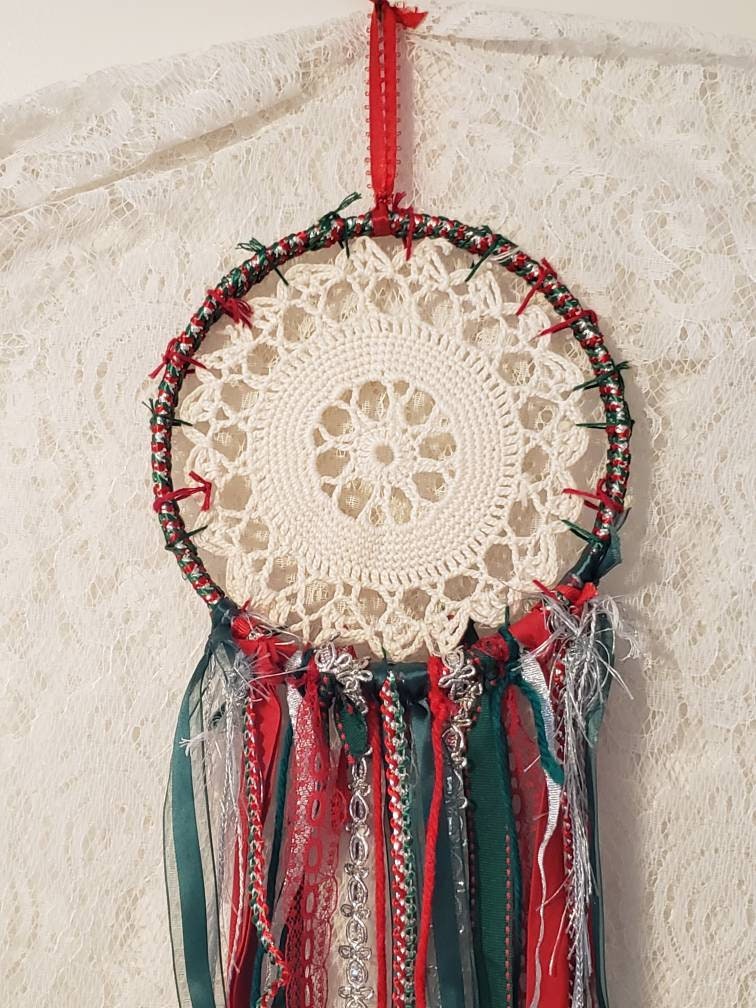 Very festive Christmas dream catcher. Handmade by me with mix of vintage/current fabric materials. Colors of pretty green, red, silver. It is perfect gift for someone who loves the holiday decorating.