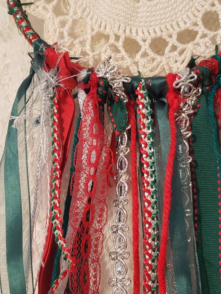 Materials: doiley, ribbons, yarn, lace, trim, wood hoop