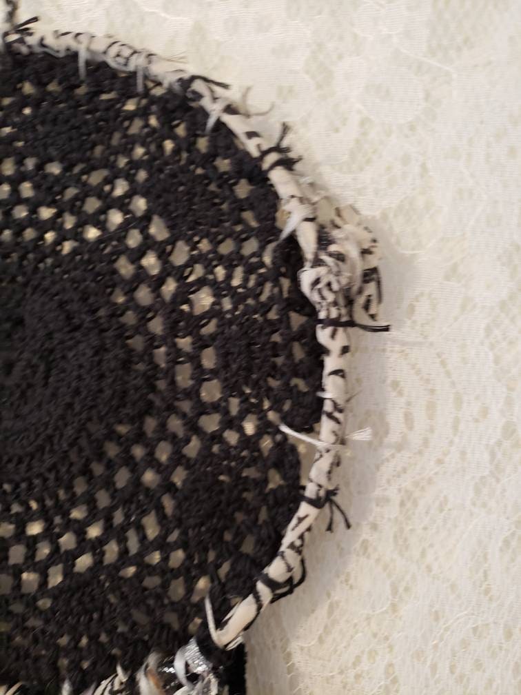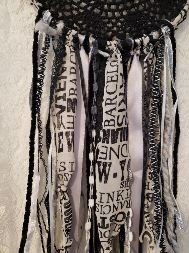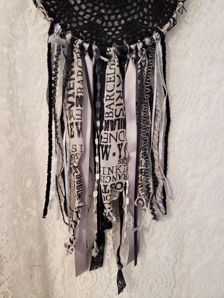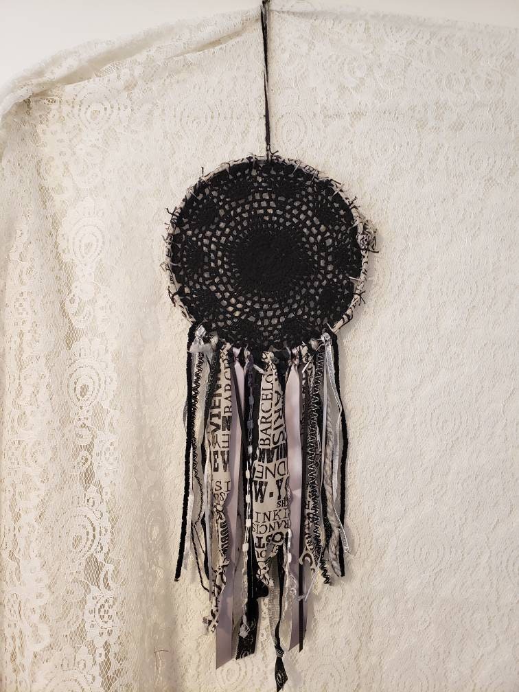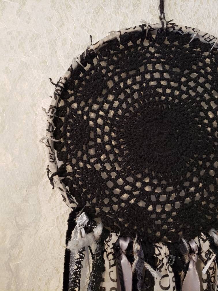 Boho Dream Catcher: Black Doiley, Recycled Fabric, Aromatherapy Decor