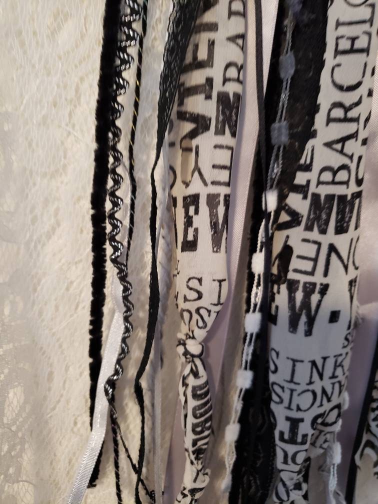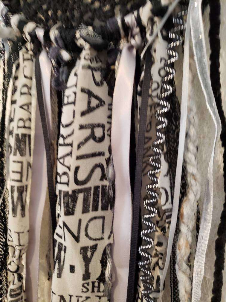 Black doiley, recycled fabric with names of important cities like London, Paris, & Barcelona.