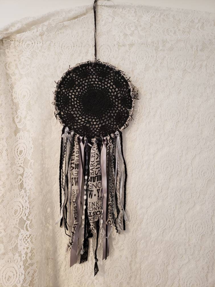 Unique colors of black, grey, silver, hint of white. Small medium size dream catcher. Perfect for gothic, wiccan, steampunk, boho decor. Handmade by me. Vintage mix of fabric materials. Great gift for a teen to put in their room.