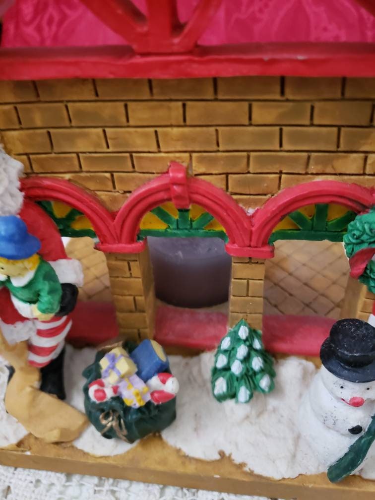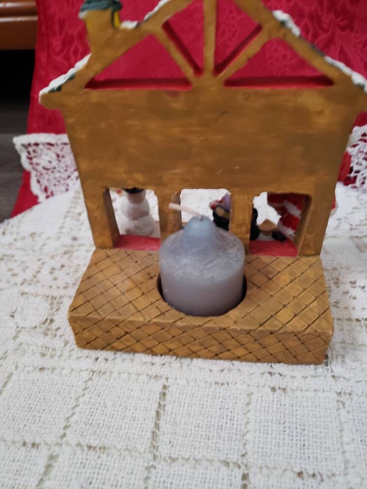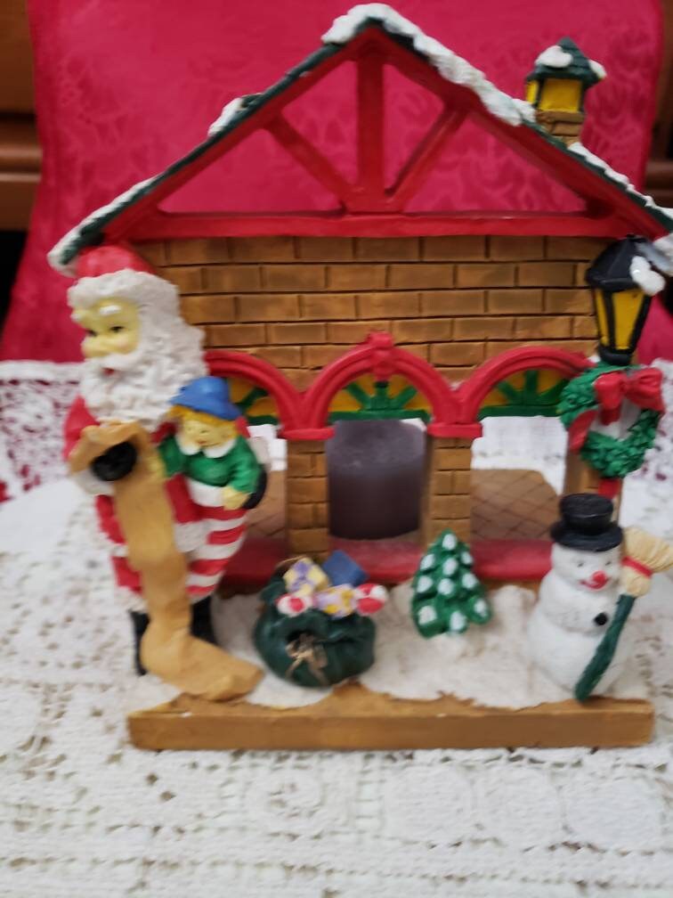 Well made vintage votive candle holder. Santa & snowman in front of wall of building. Very colorful & detailed. Including vintage blue candle too.