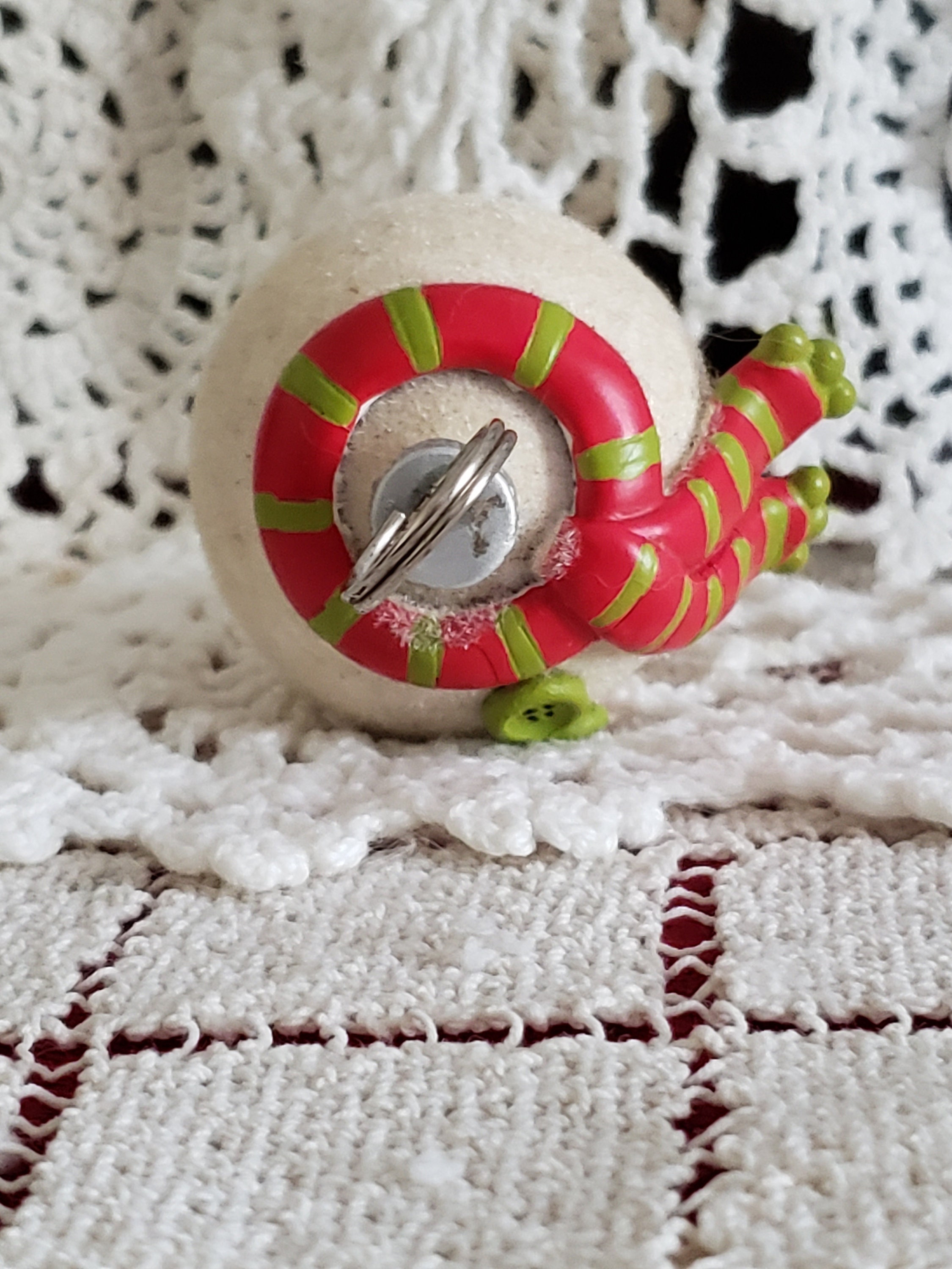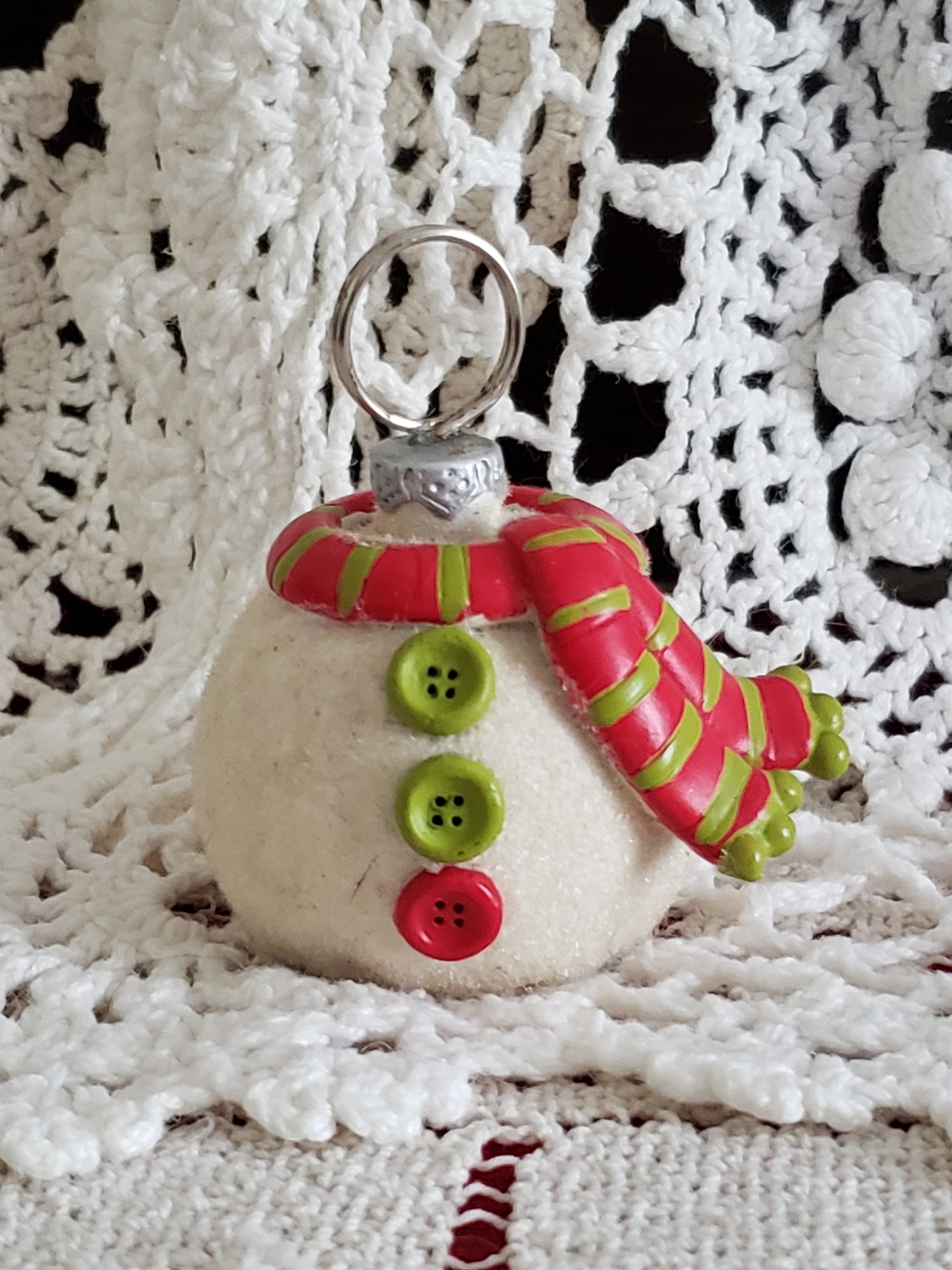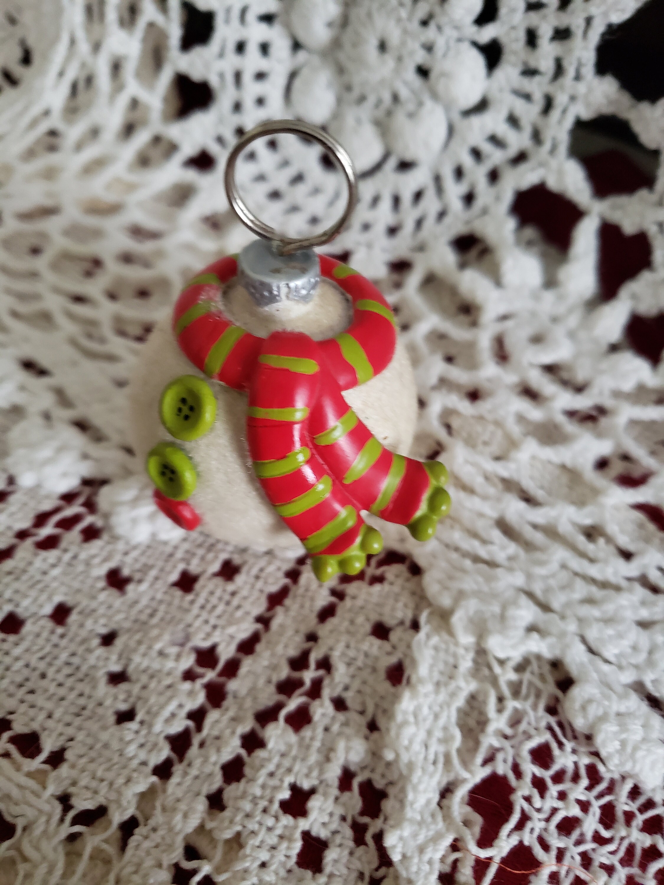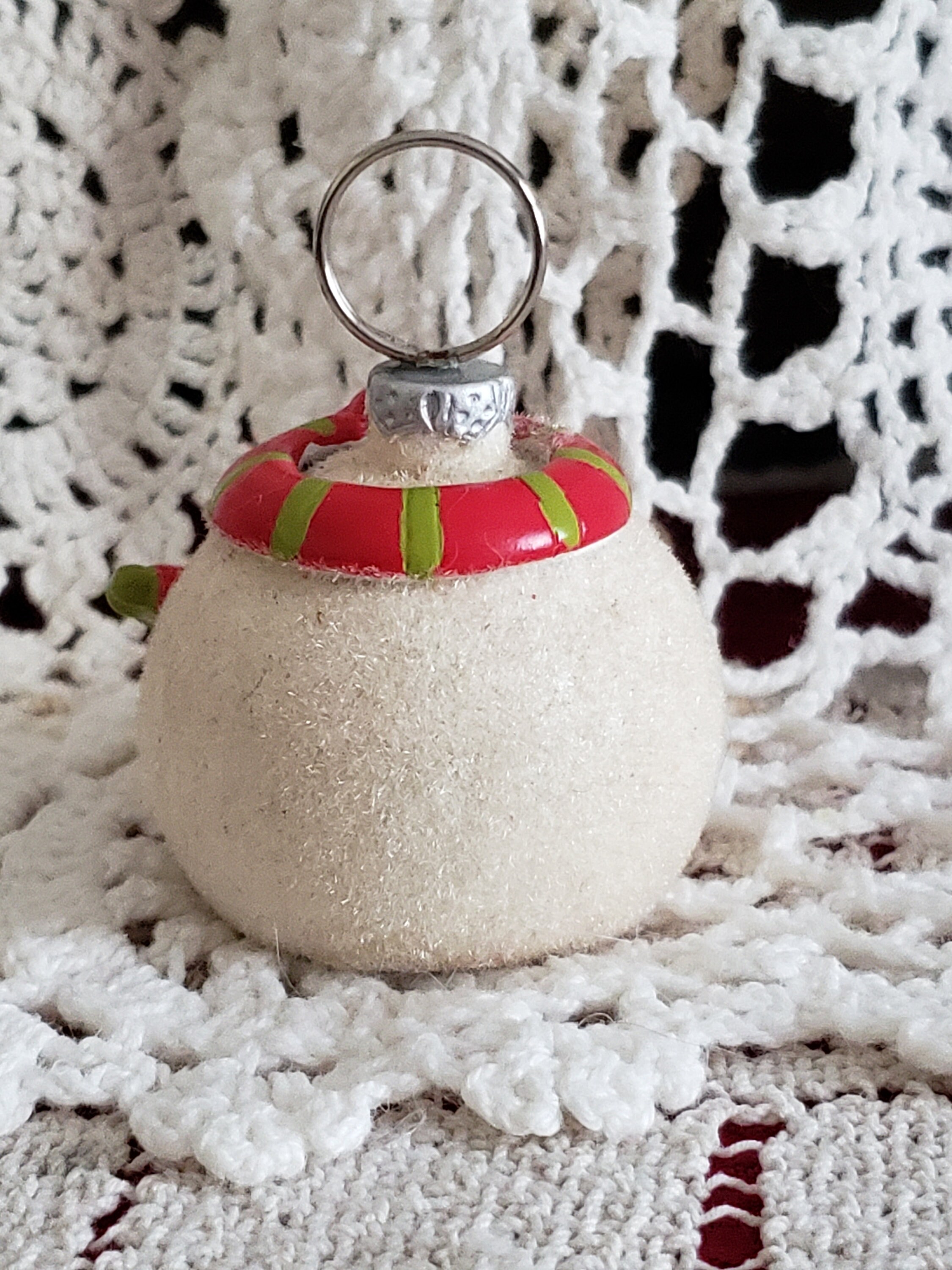 Cute Christmas decoration. A card holder or could be used as a Christmas ornament, it is heavy. Inexpensive gift for the holiday fan. Whimsical piece for a fun holiday table setting to hold paper cards or photo. Has felt over resin colorful green/red scarf & buttons. Also there is a silver cap. Retro/vintage piece. Gently used, good condition. Been in my holiday collection for years.