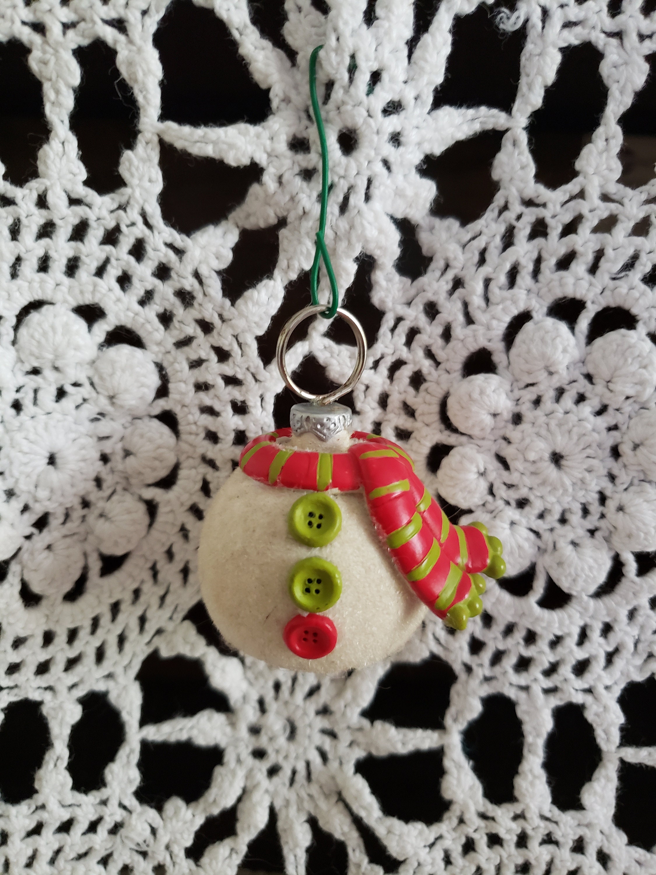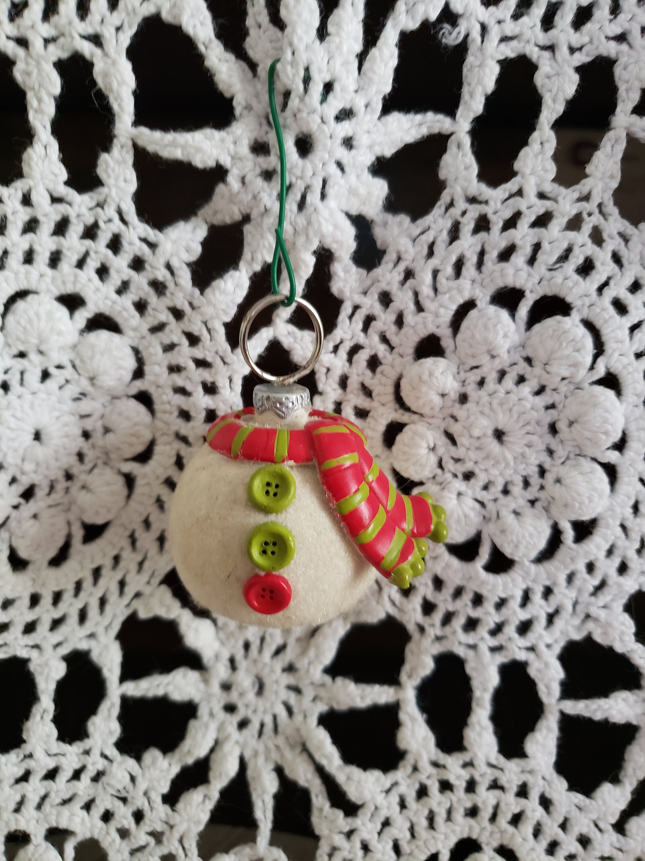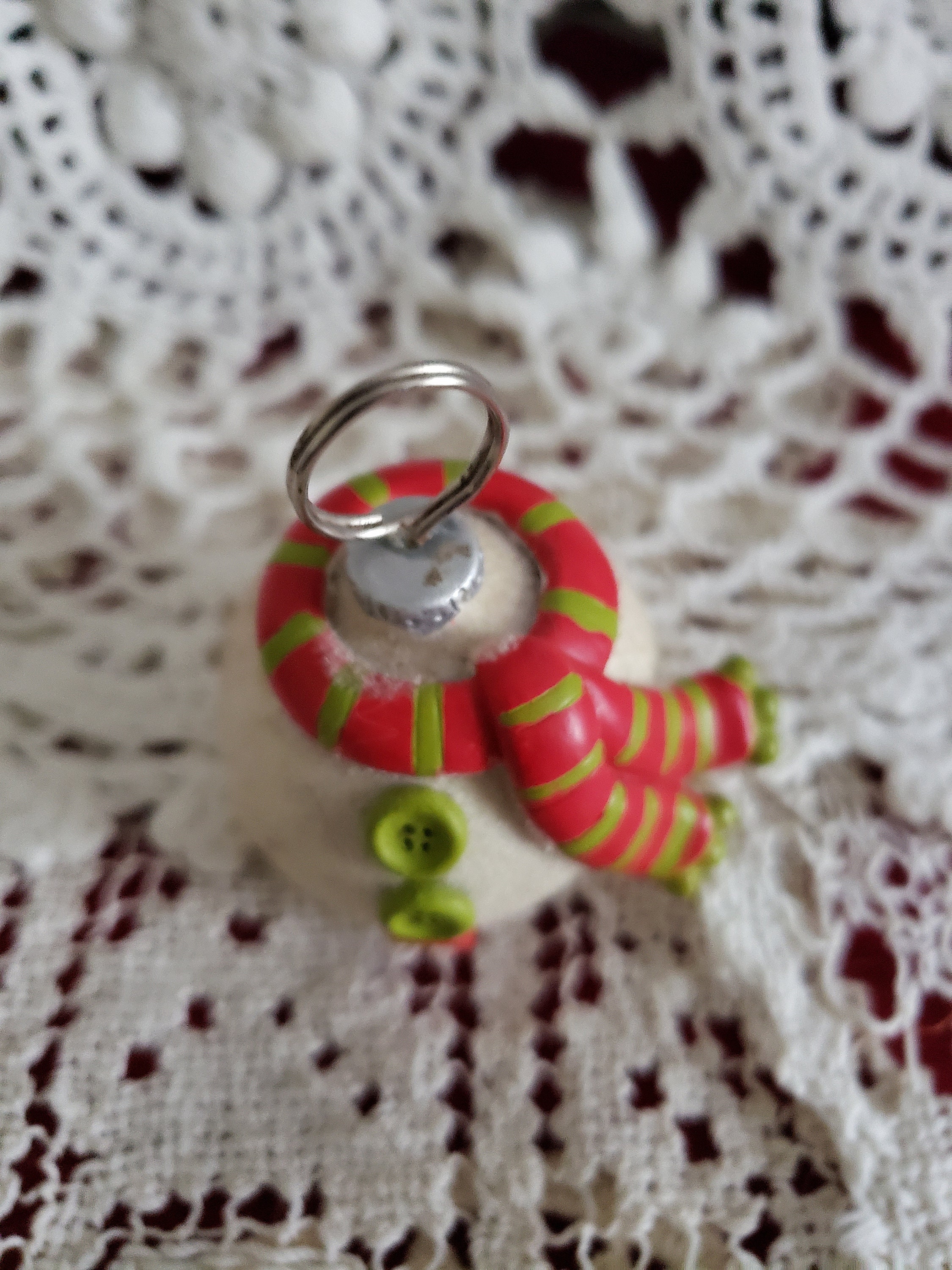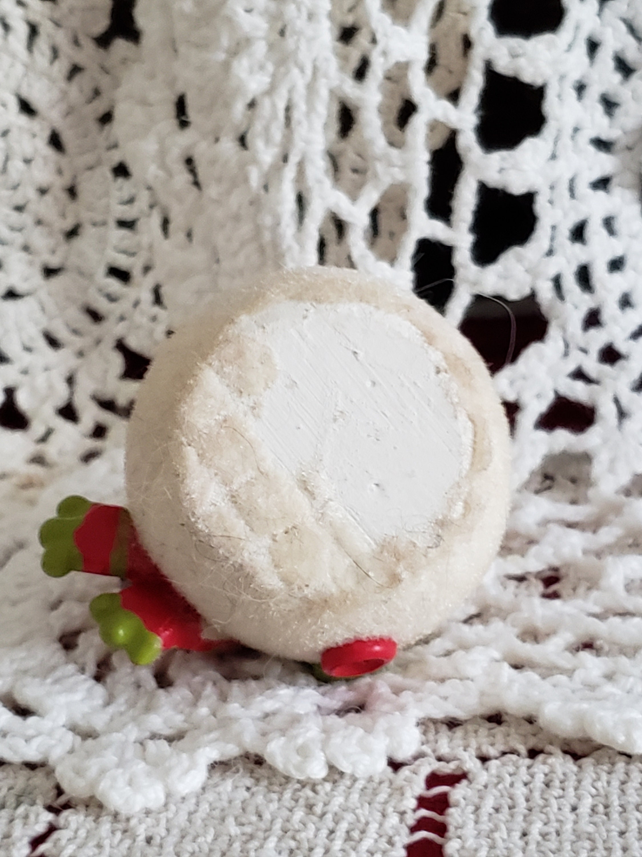 Cute Christmas decoration. A card holder or could be used as a Christmas ornament, it is heavy. Inexpensive gift for the holiday fan. Whimsical piece for a fun holiday table setting to hold paper cards or photo. Has felt over resin colorful green/red scarf & buttons. Also there is a silver cap. Retro/vintage piece. Gently used, good condition. Been in my holiday collection for years.