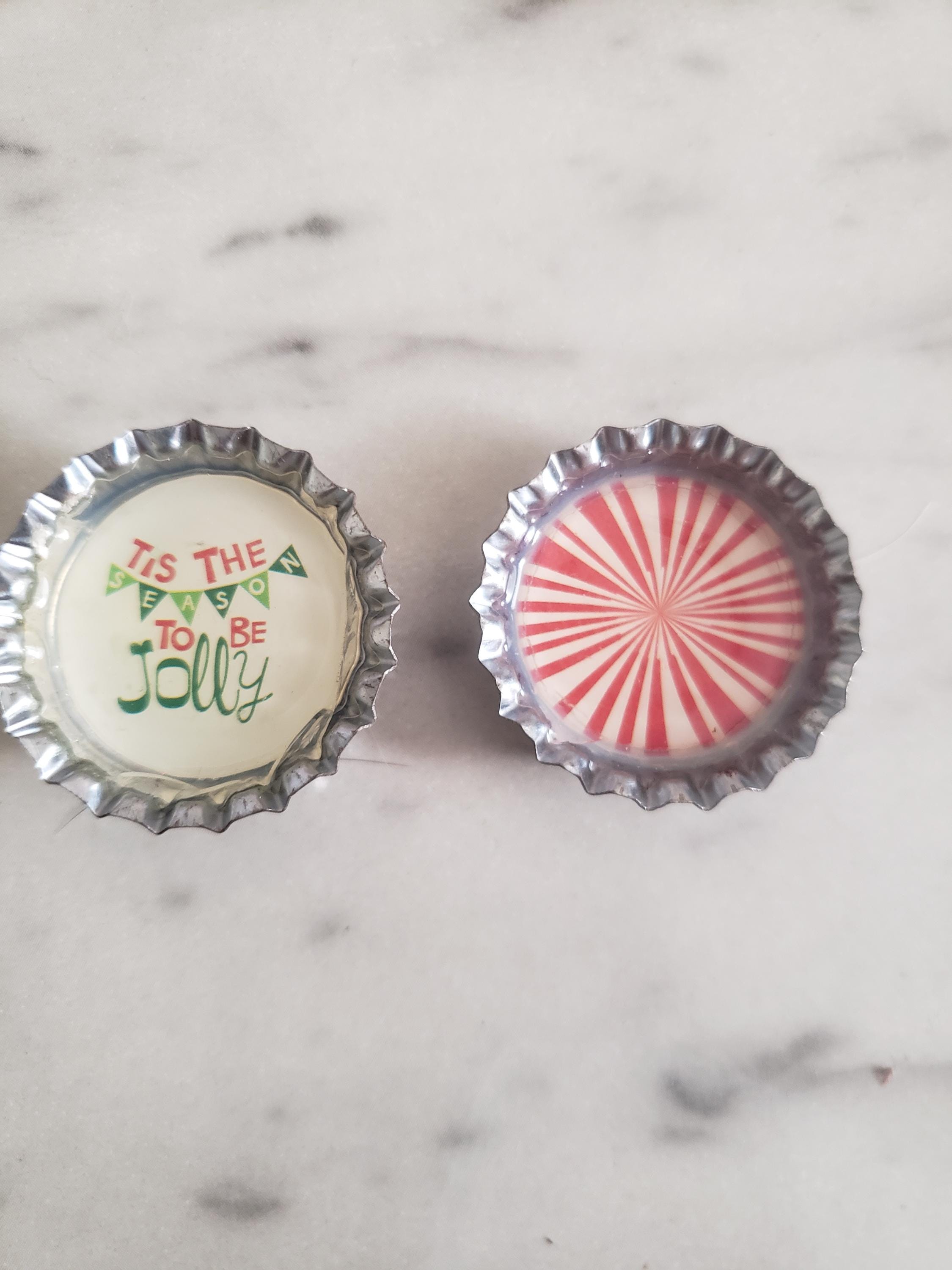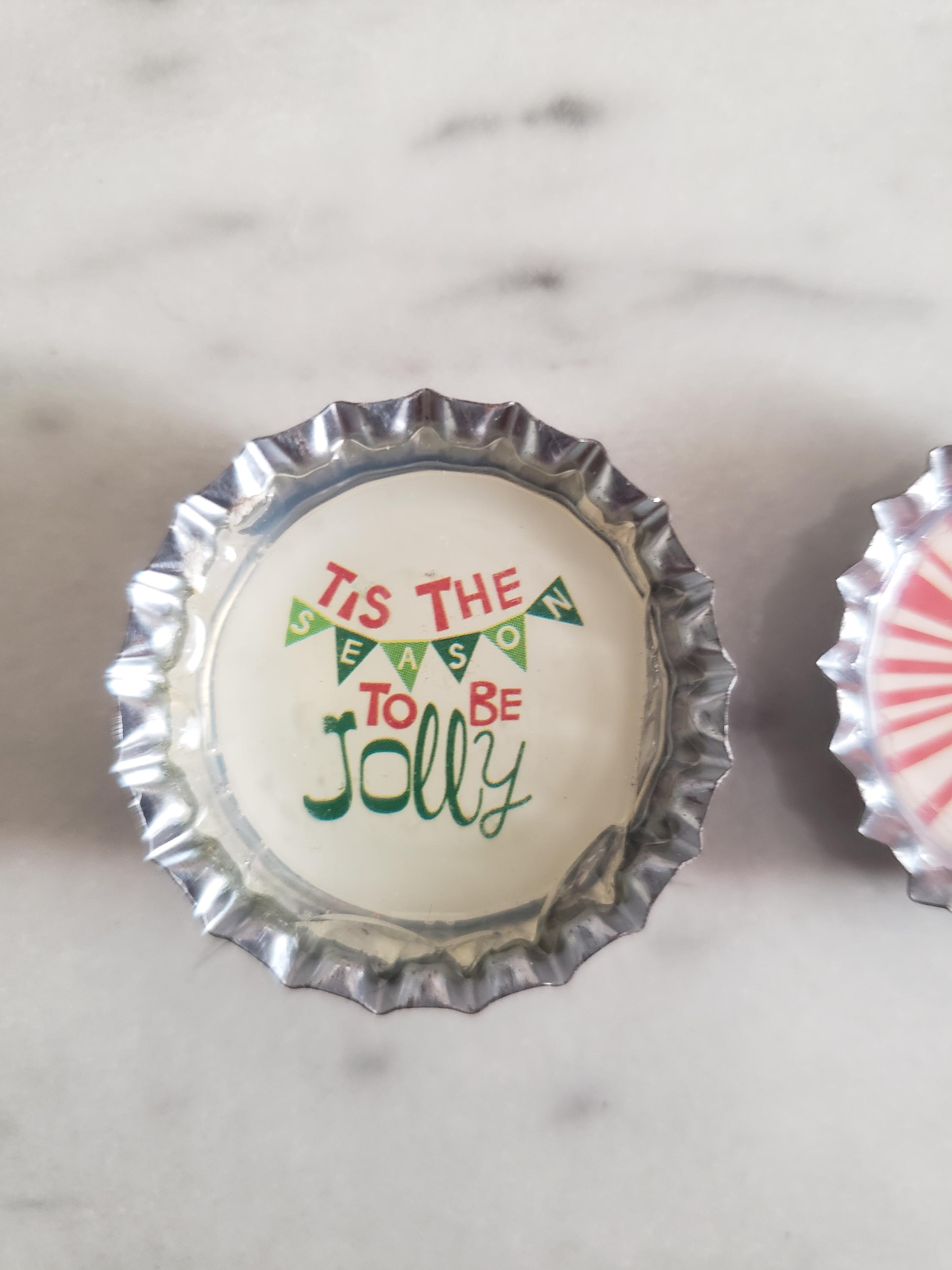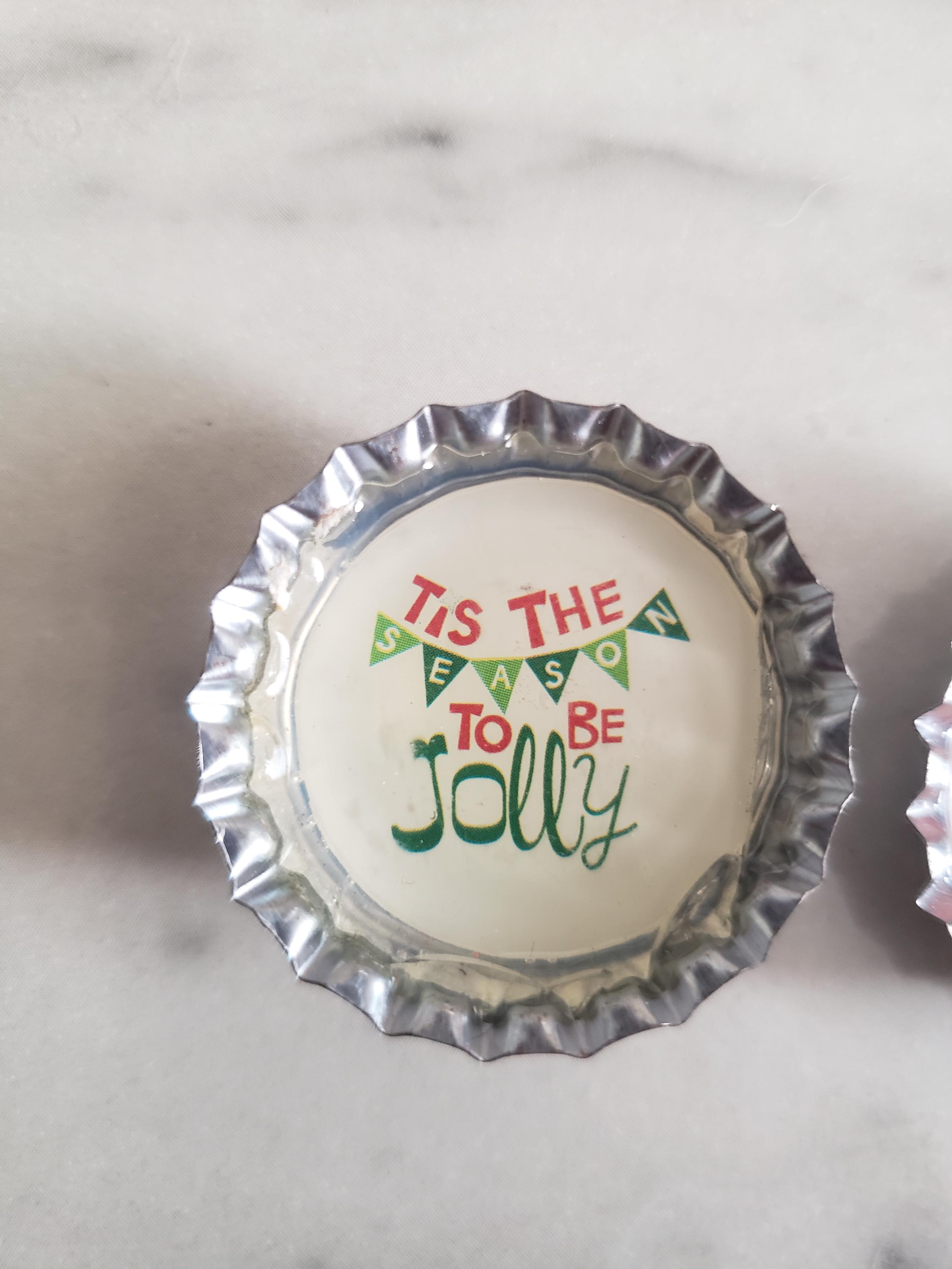 Set of 2 cute Christmas bottle cap magnets for the holidays. One has red/white representing a peppermint candy & other has cute festive saying "Tis the season to be Jolly". Handmade by my friend.