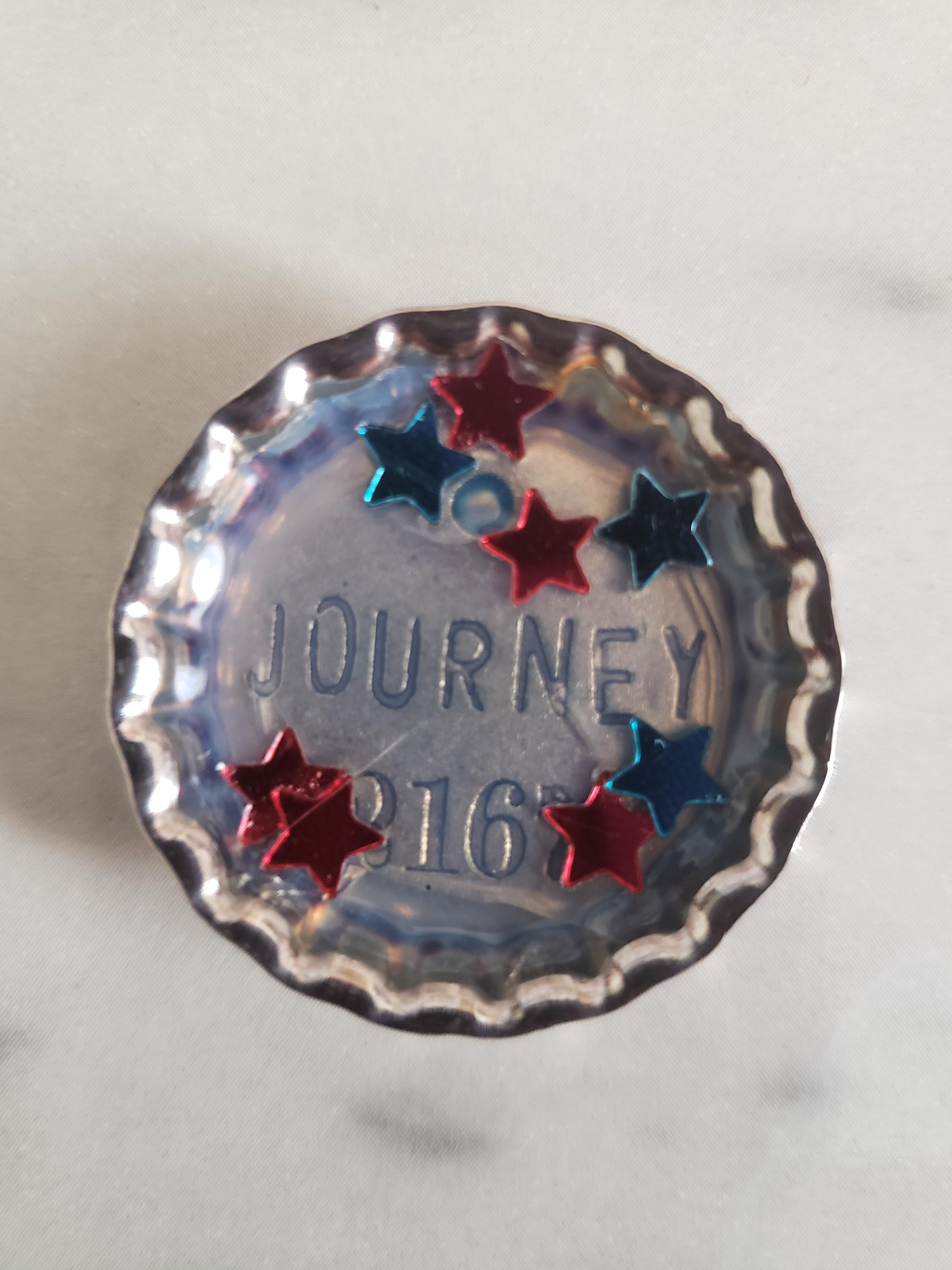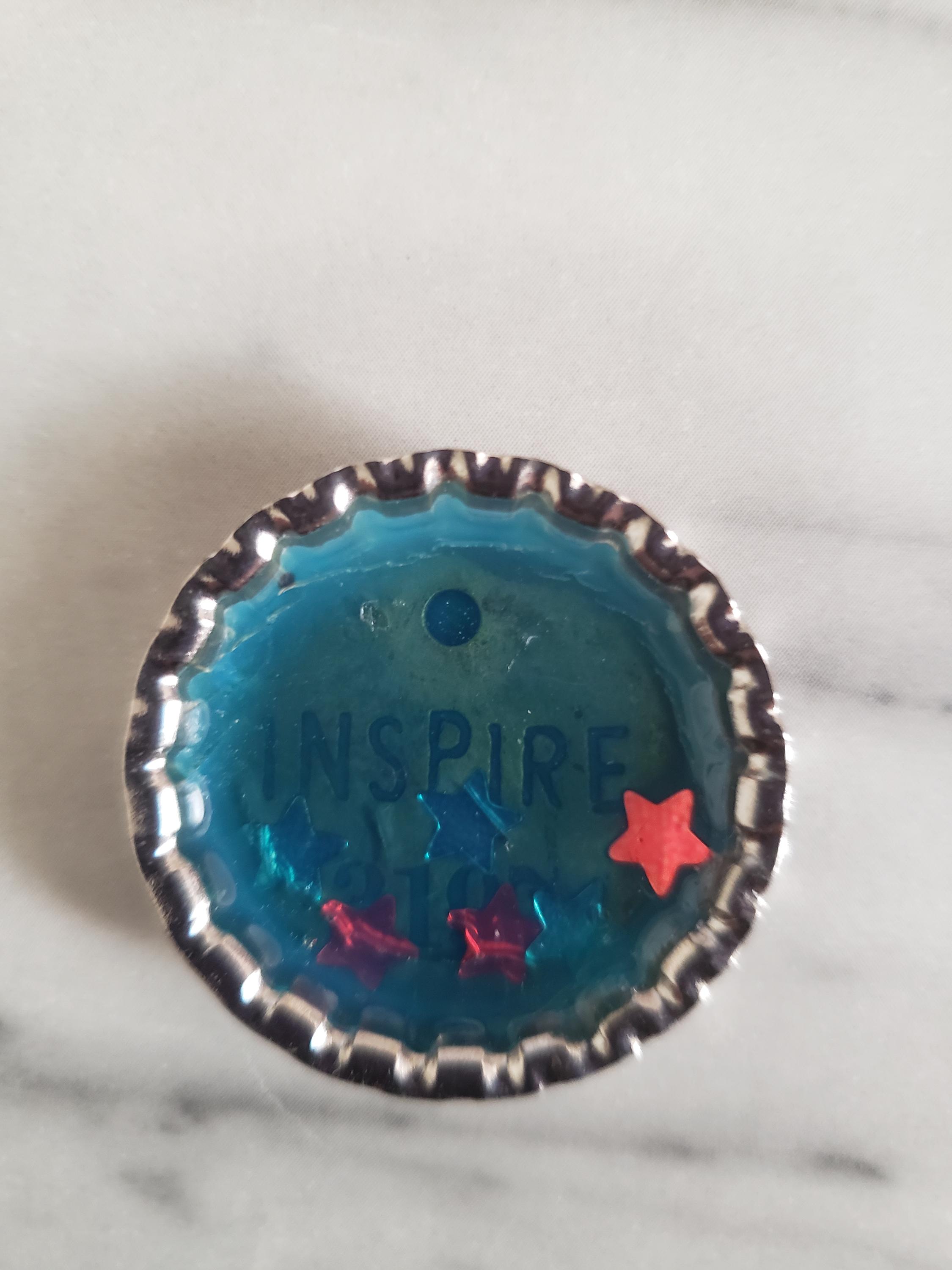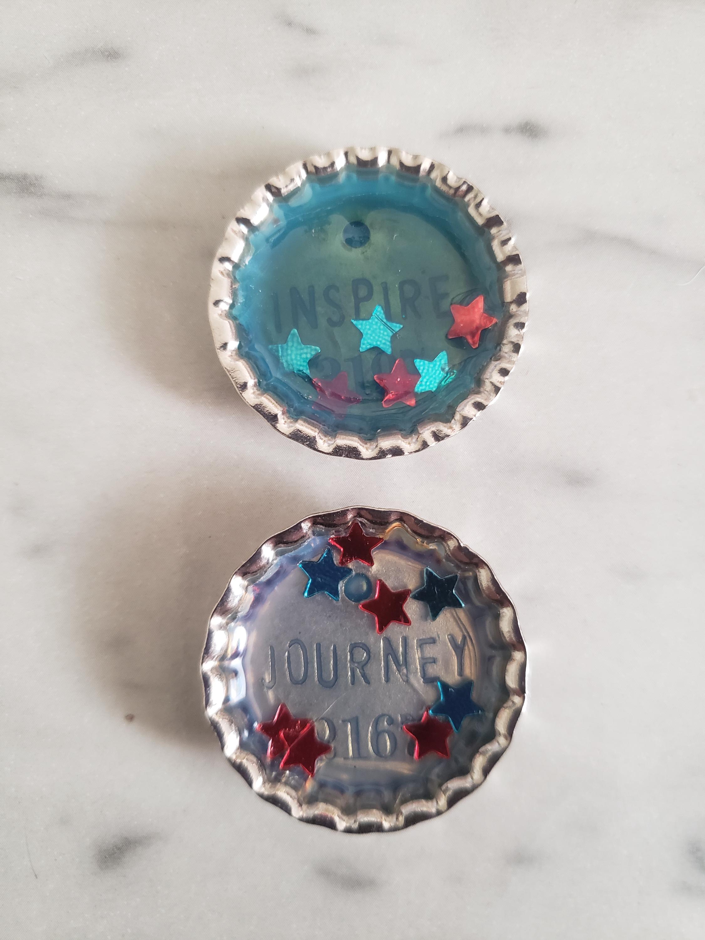 Cute bottle cap magnets. Set of 2. Handmade by one of my dearest friends. She used bottlecaps, resin, small objects, with one saying "journey" and other "inspire".