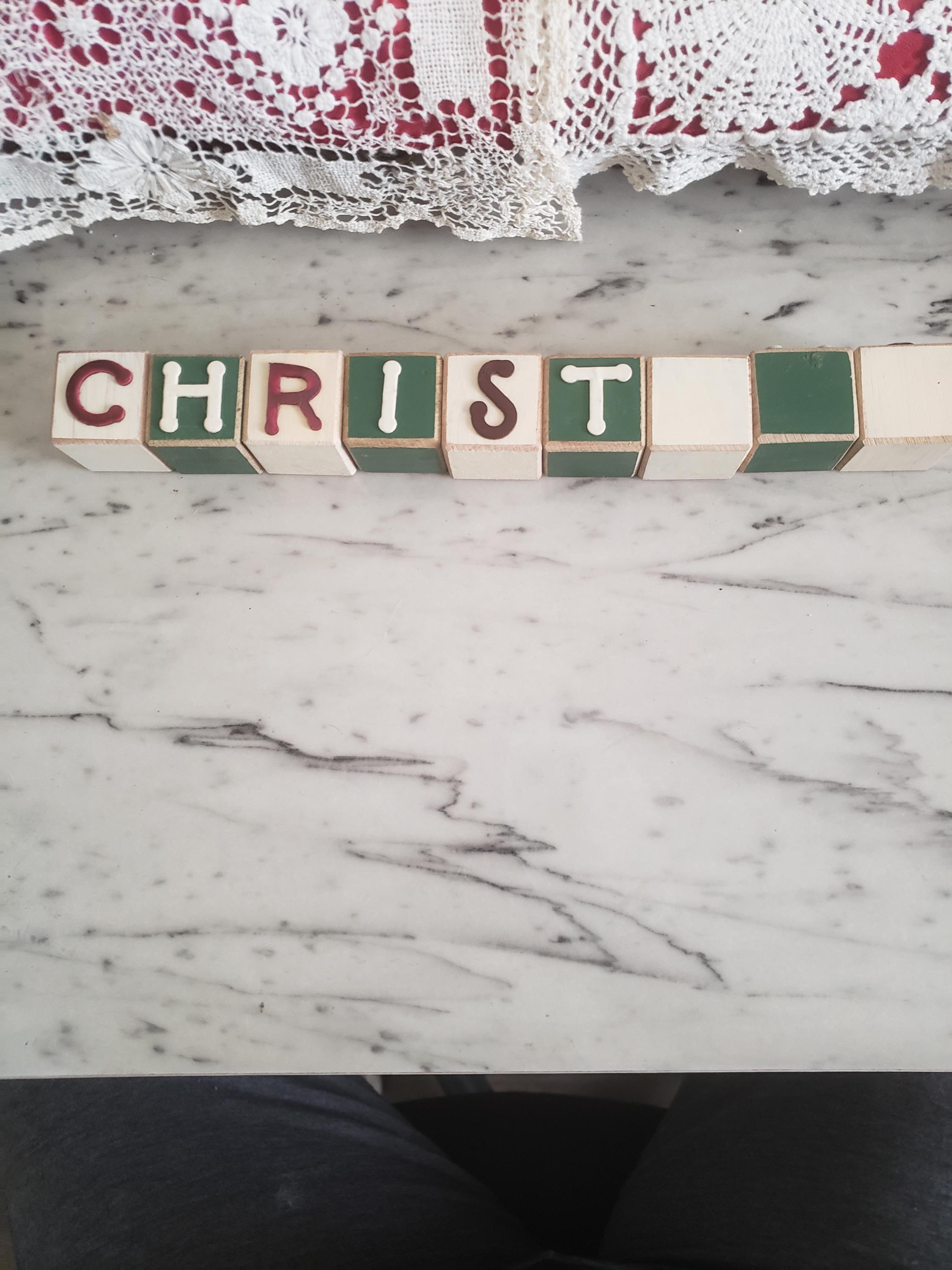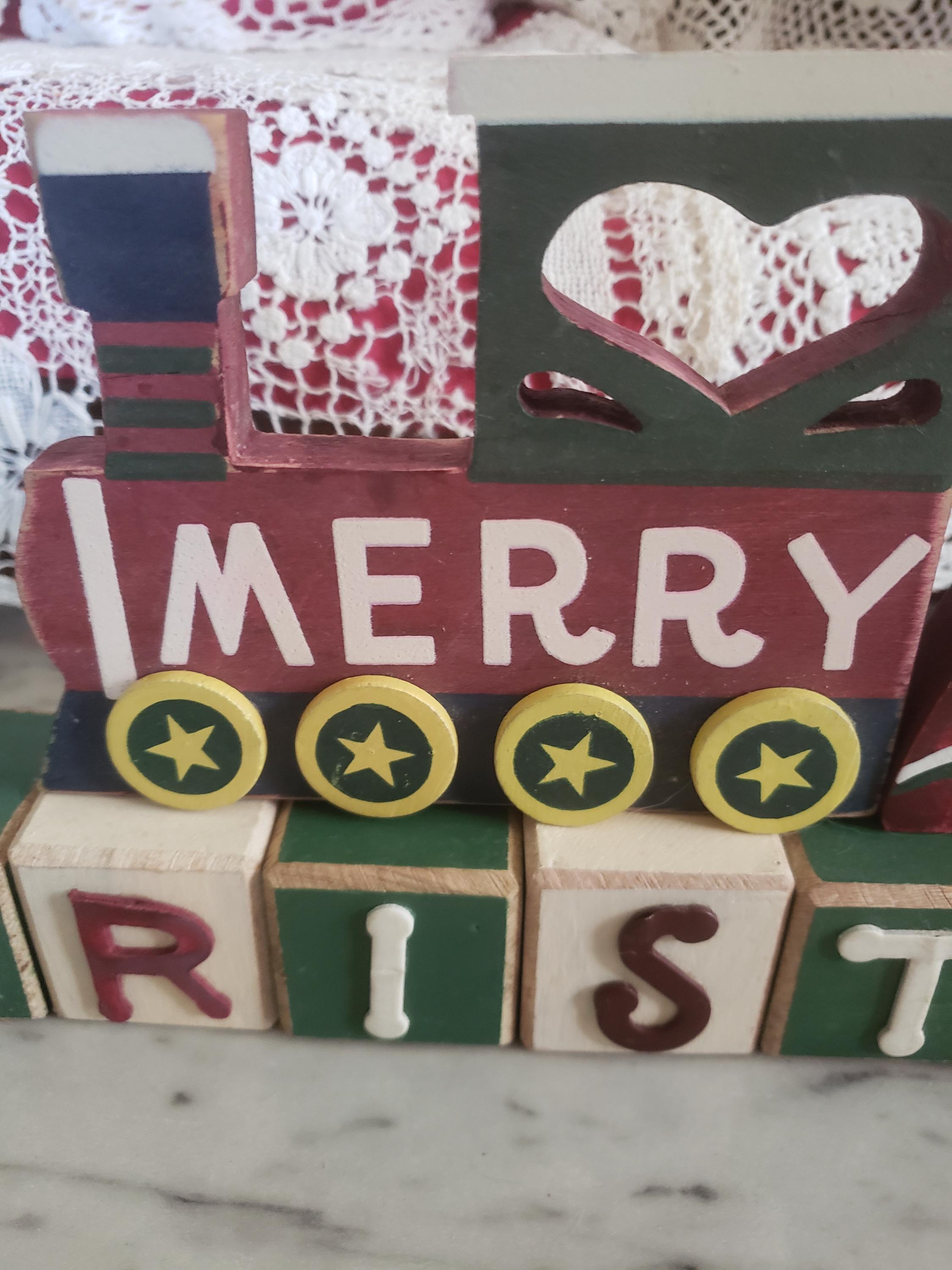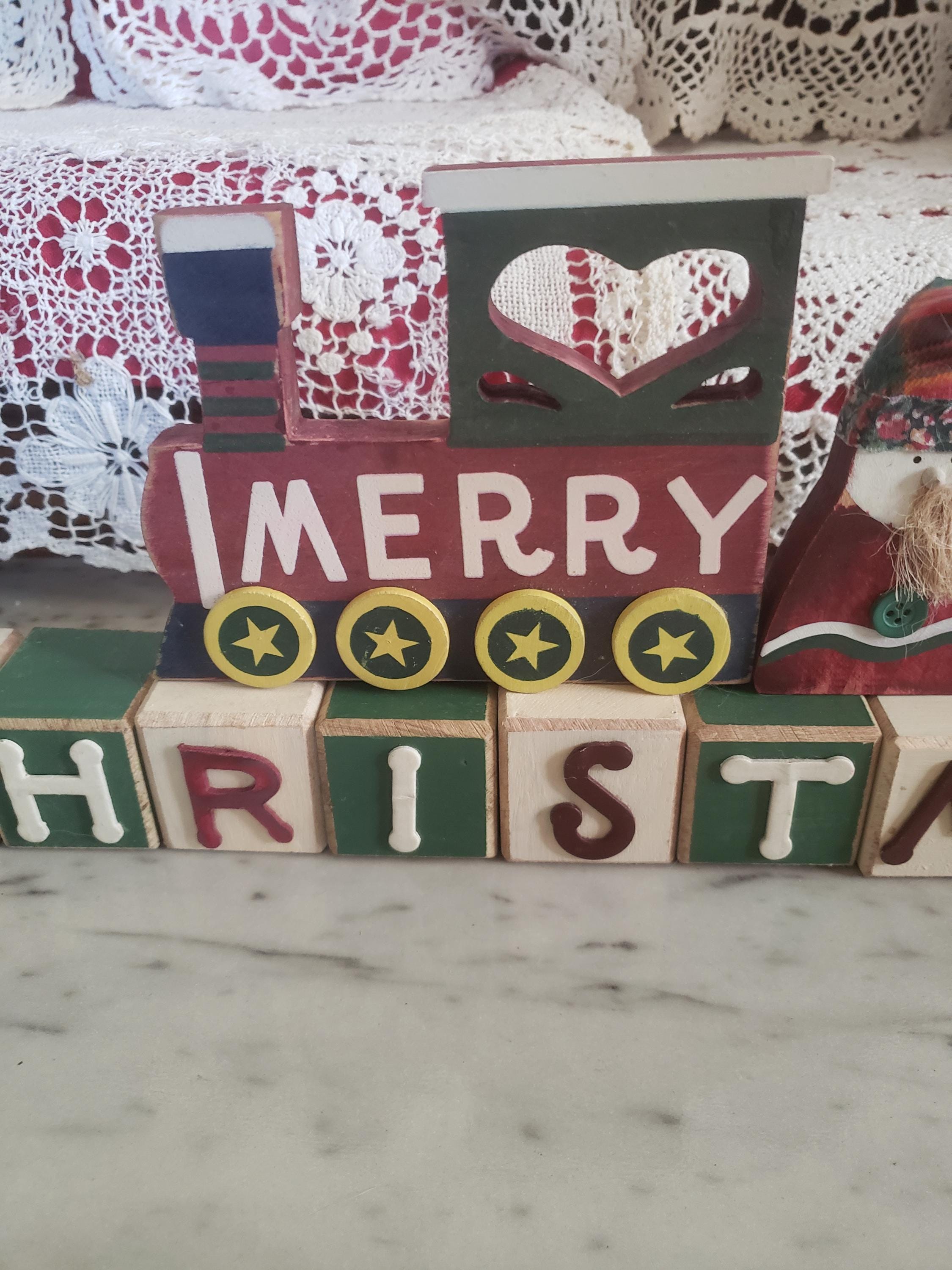 Christmas train with "Merry", letter blocks that spell Christmas, and wood Santa with country hat.