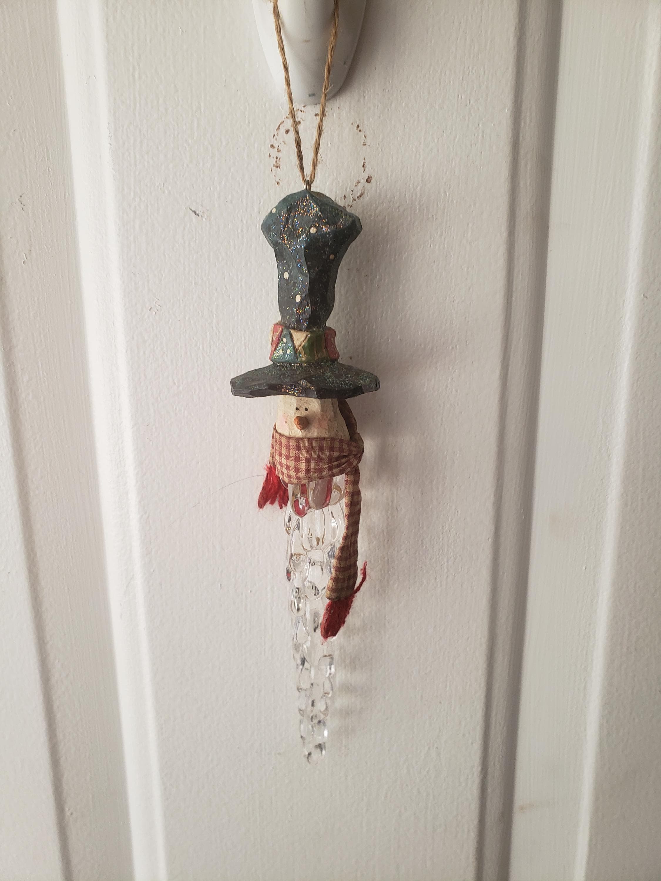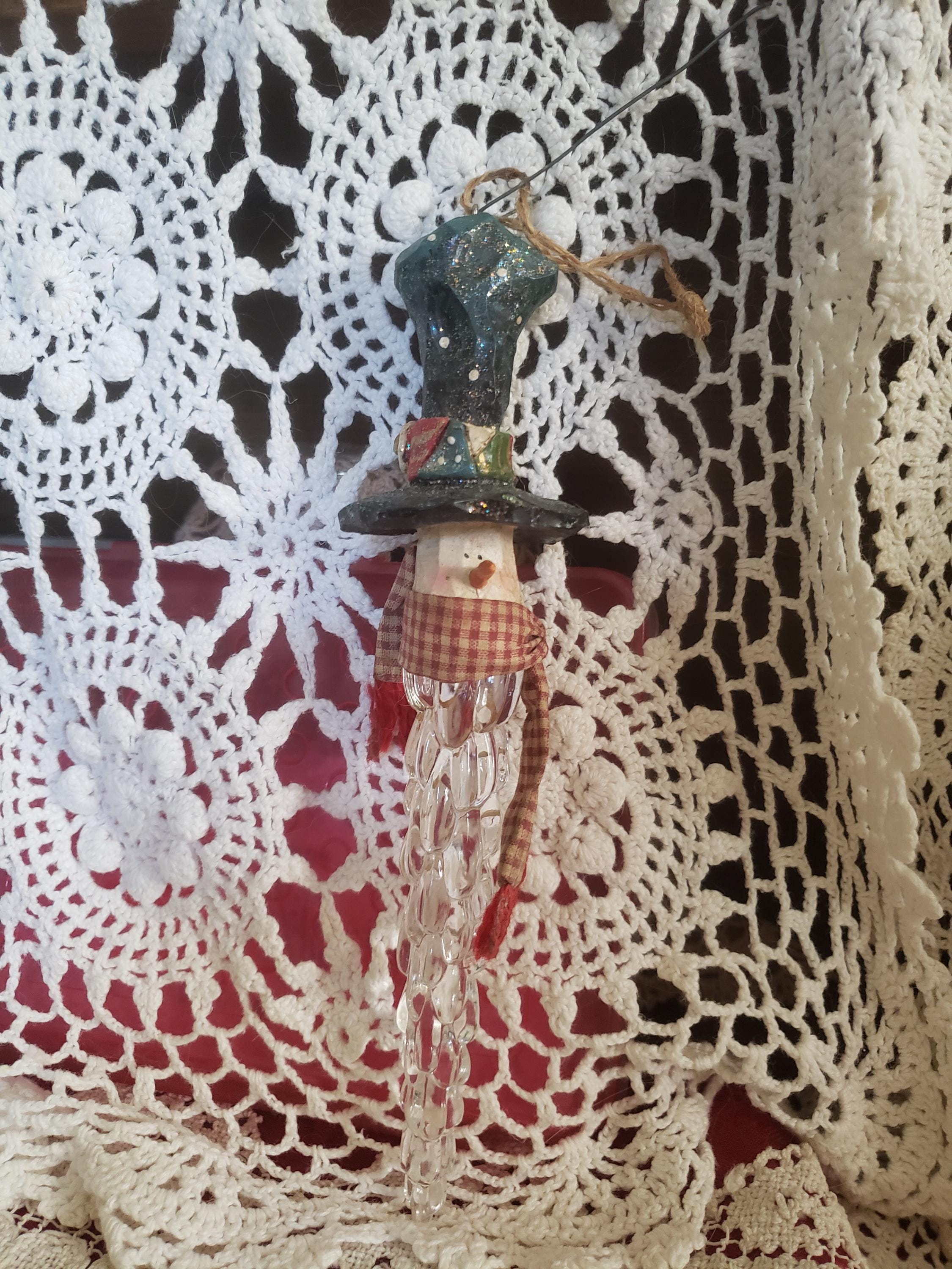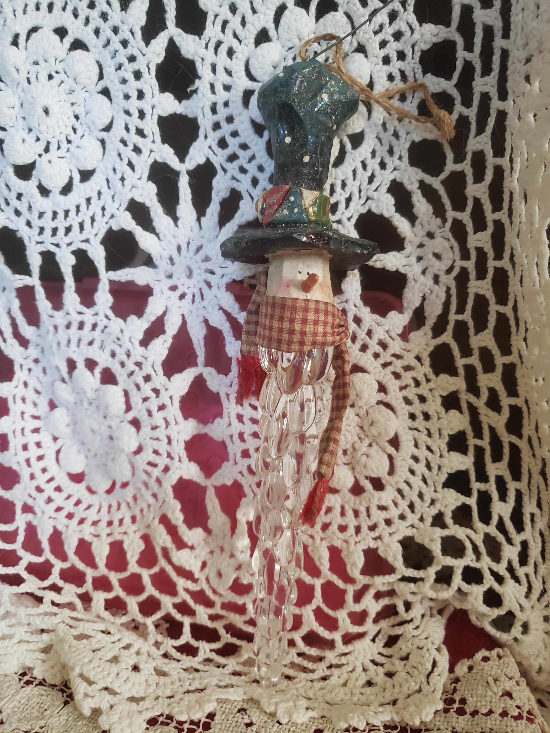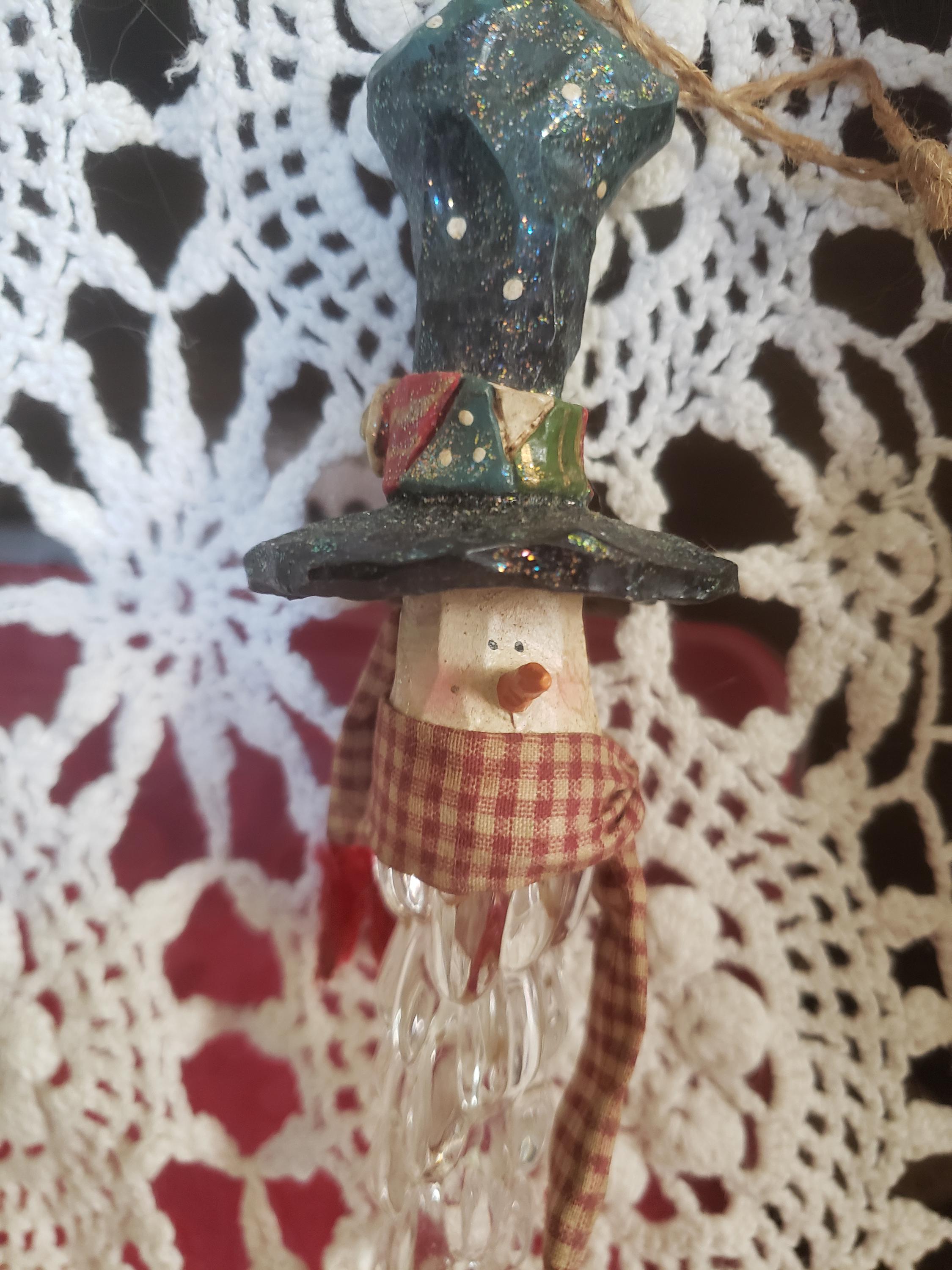 Unique Christmas Snowman ornament to hang on a big Christmas tree(heavy weight ornament), small hook on a country display or doorknob. Been in my Christmas collection for 1990's. Been stored in tote, gently used good condition.