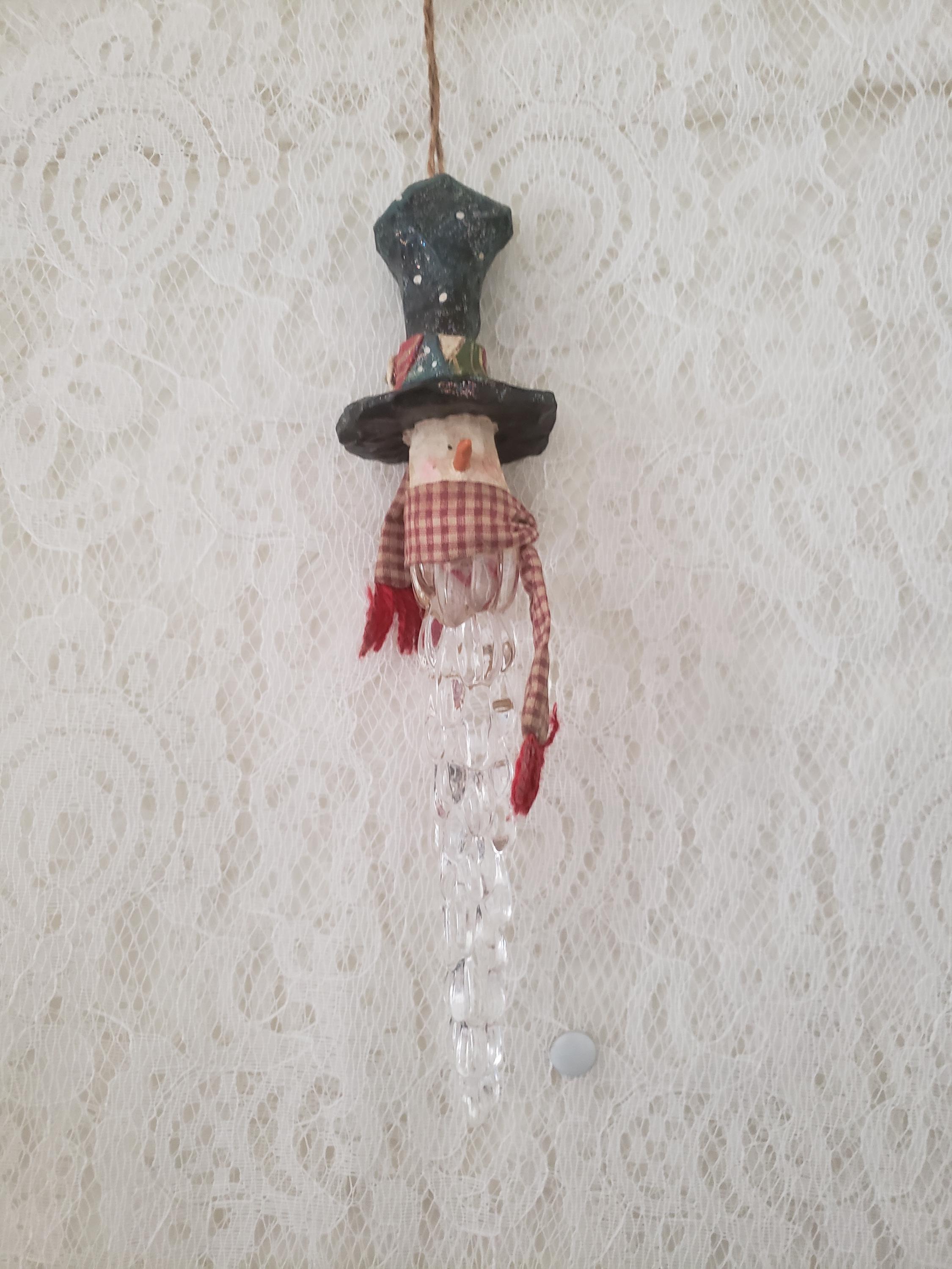 Snowman face on the top with hap and carrot nose. He is wearing a country scarf and rest of his body is icicle. Very unique decoration to display all winter long.