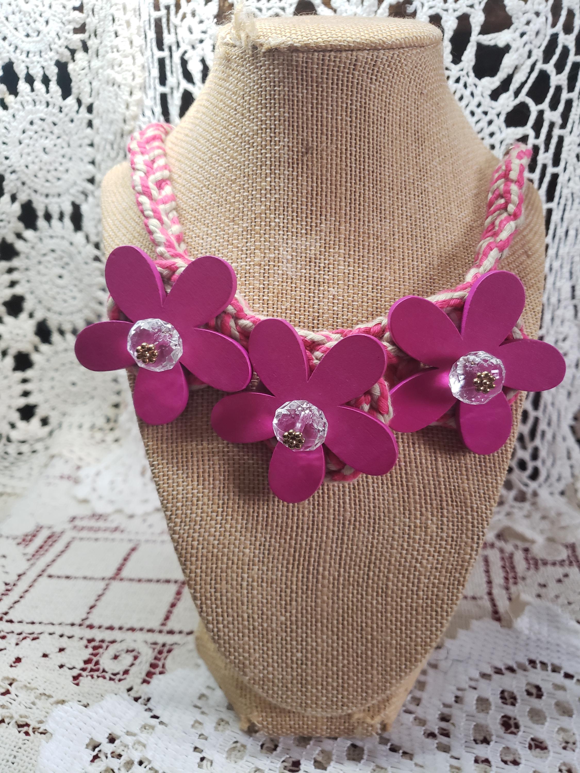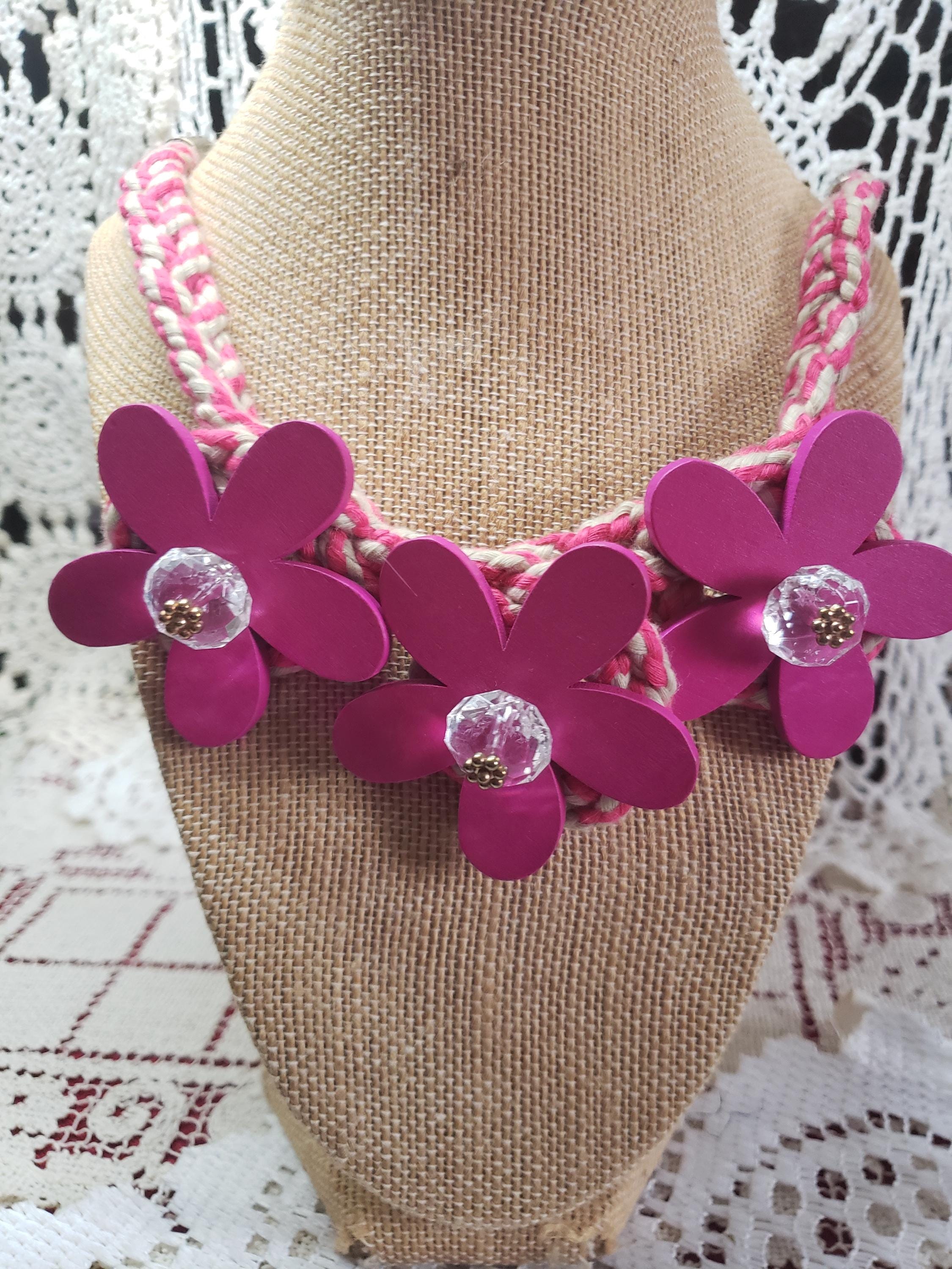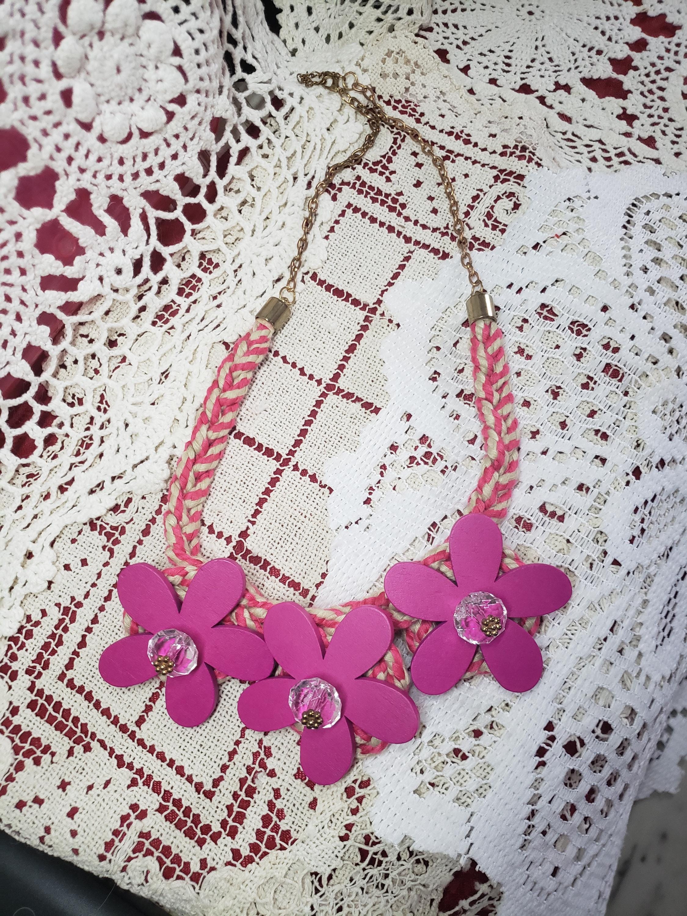 Cute cute funky chunky handmade necklace. Handmade by my dear friend. Pretty pink with crystal clear fashion beads and pink wood painted flowers. Adjustable necklace(7" to 13" L) with lobster clasp. Also have a lime/soft grey color same style. A must for hippie jewelry collection.