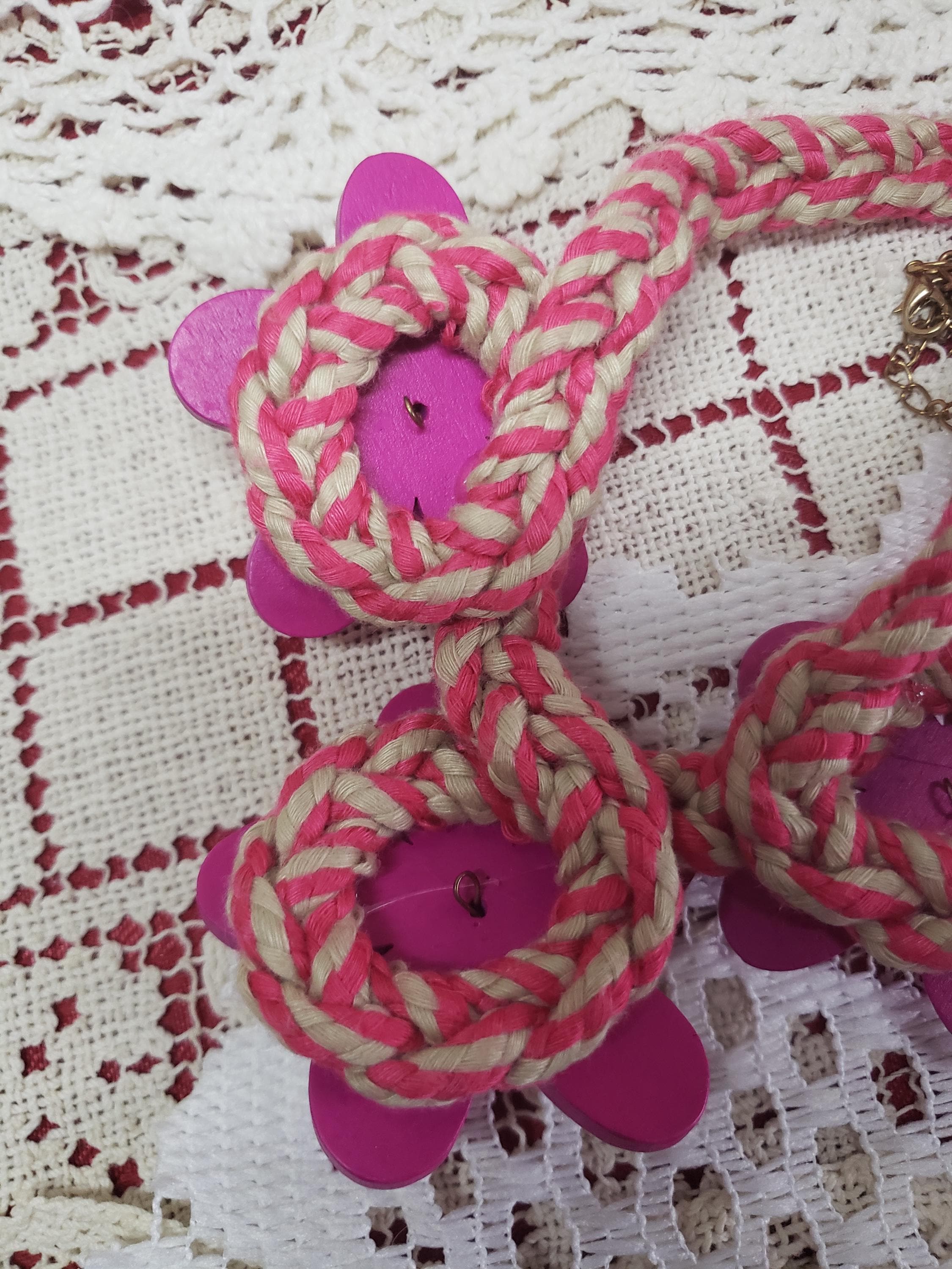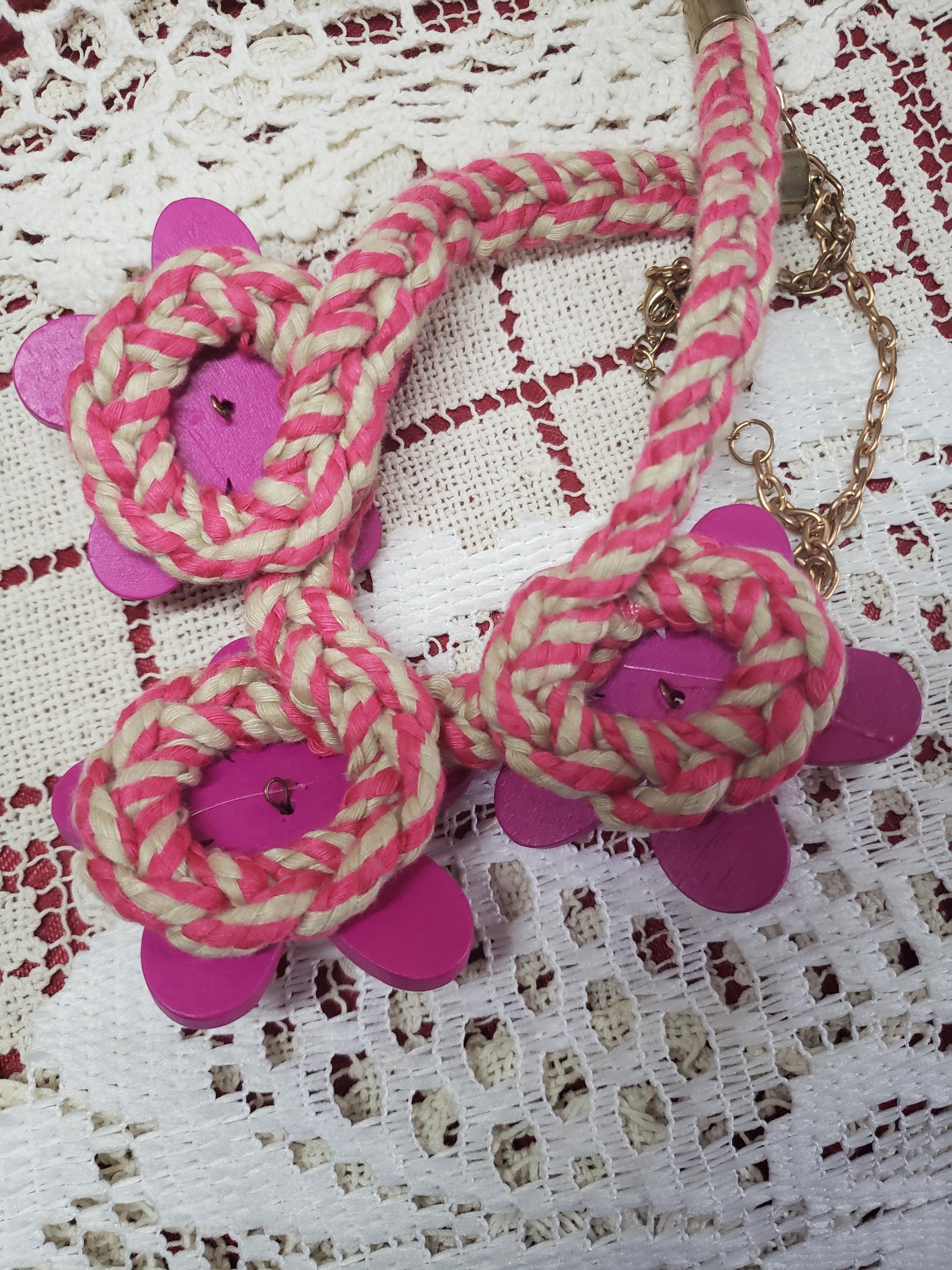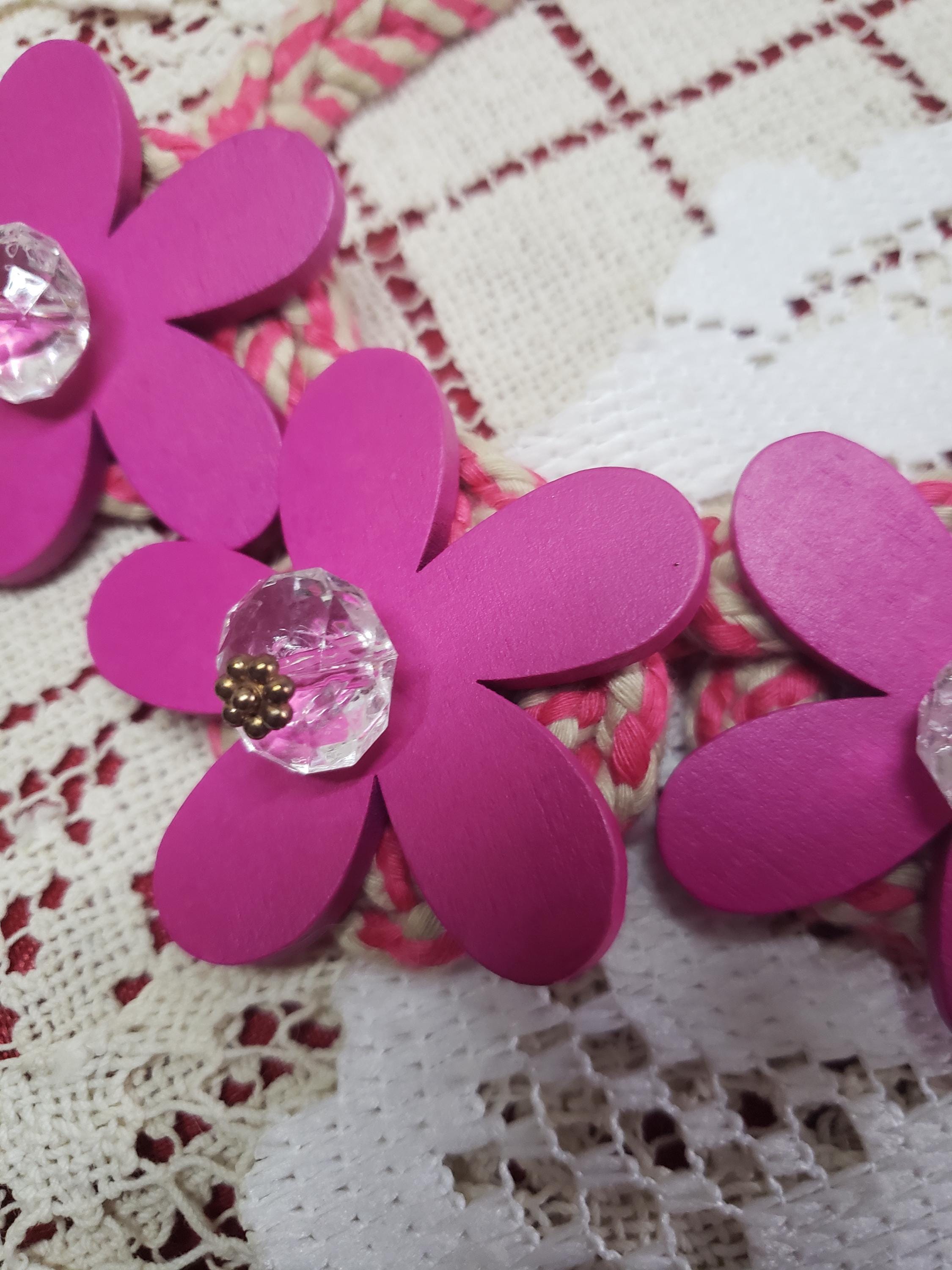 Cute cute funky chunky handmade necklace. Handmade by my dear friend. Pretty pink with crystal clear fashion beads and pink wood painted flowers. Adjustable necklace(7" to 13" L) with lobster clasp. Also have a lime/soft grey color same style. A must for hippie jewelry collection.